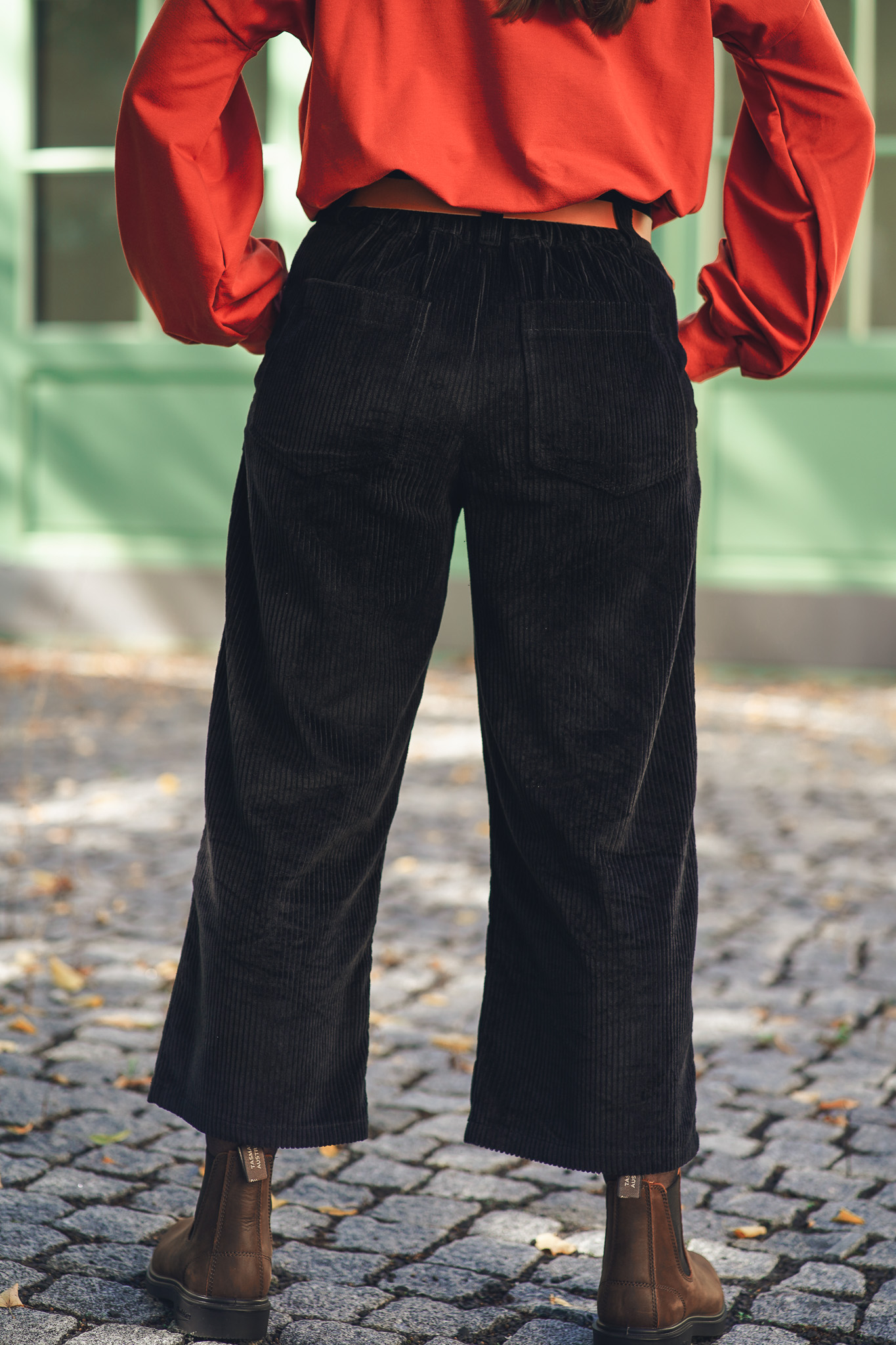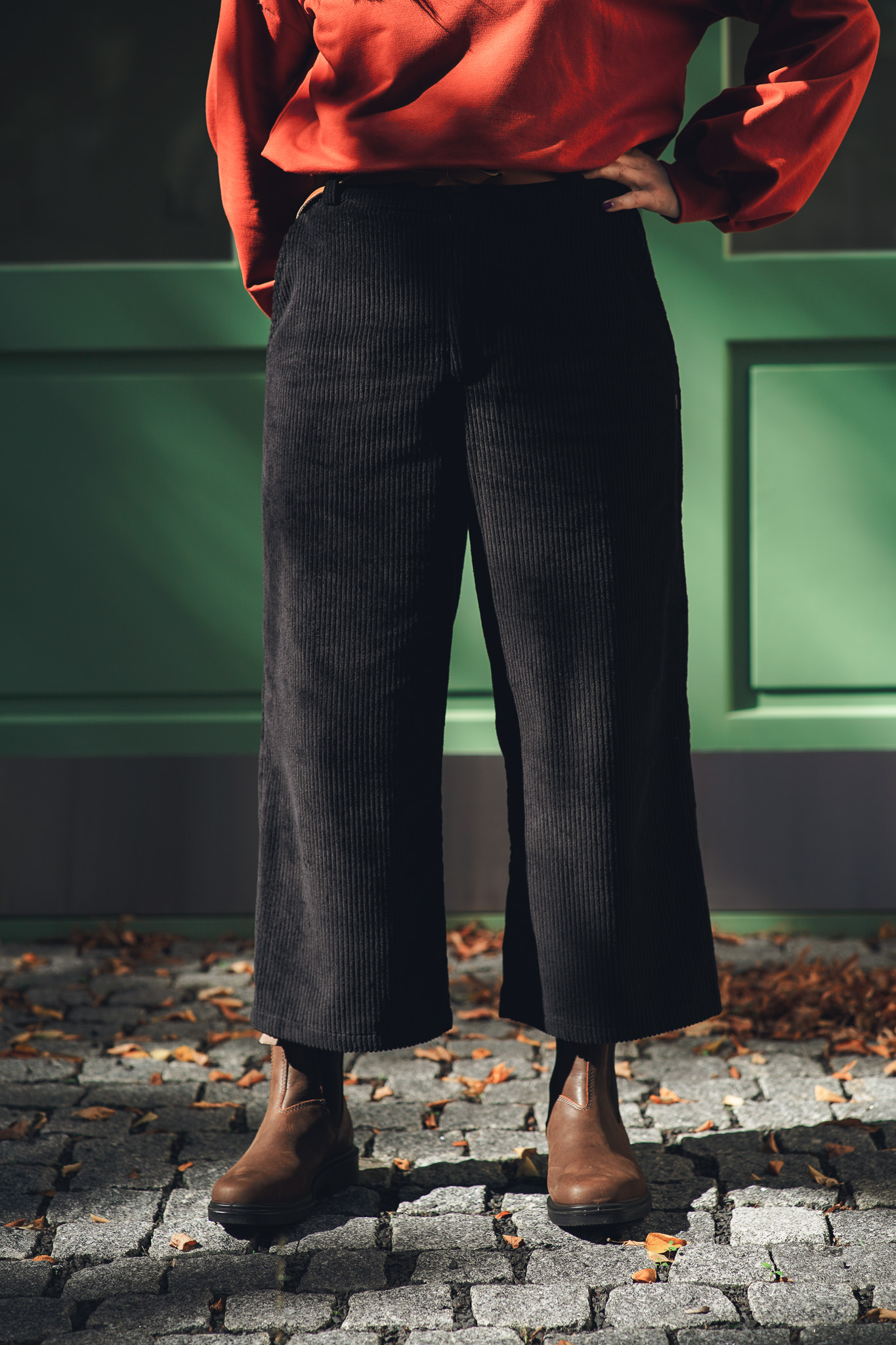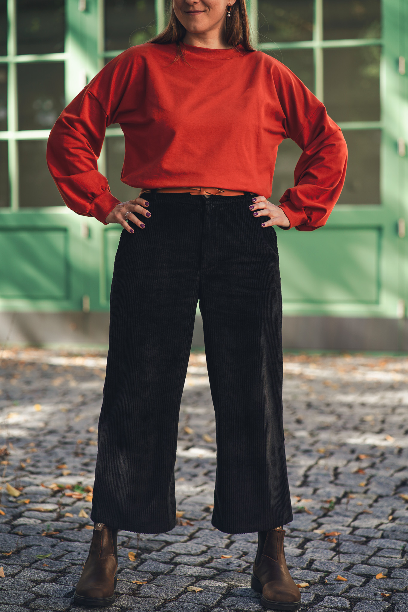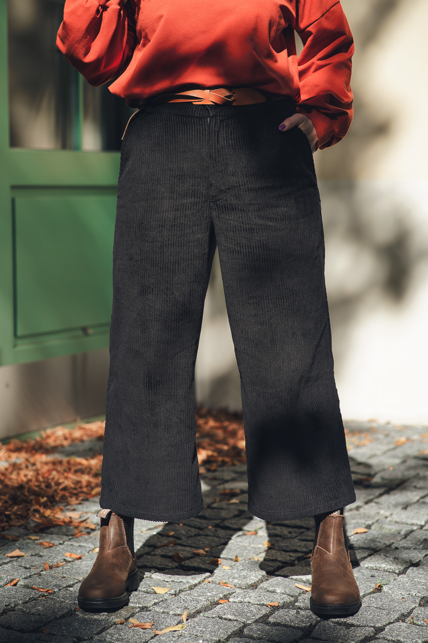 ×Tyto kalhoty Culottes jsou ušité z příjemného silnějšího manchesteru, který lehce pruží. Kalhoty jsou propracované a mají delší délku nohavic než naše klasické culottky. Zapínají se na zip a knoflík, navíc mají v zadní části pasu gumu, která se pohodlně přizpůsobí a nechybí ani praktické boční kapsy a dvě kapsy vzadu. Tento model je vhodný i pro postavy s širšími boky.