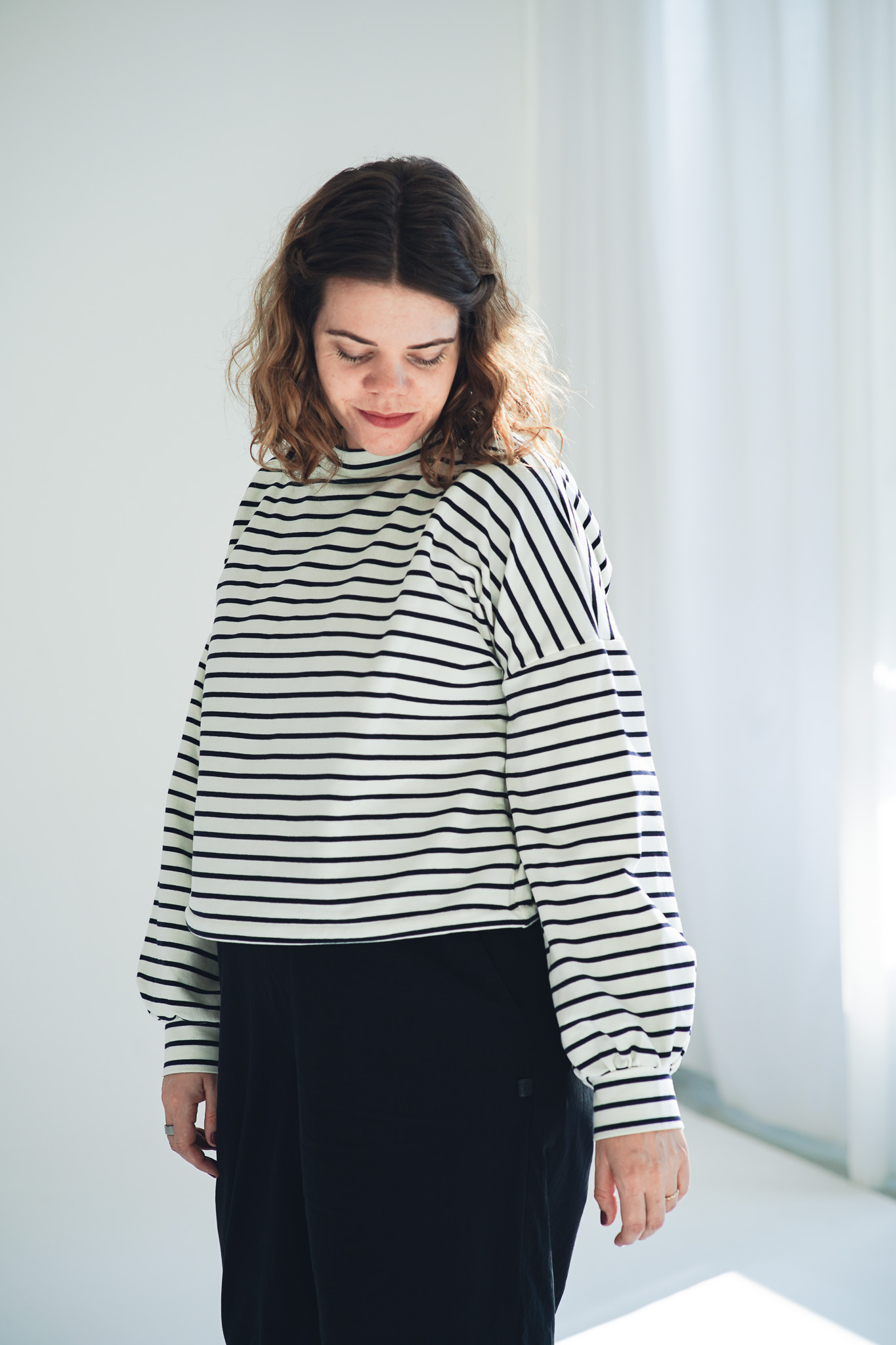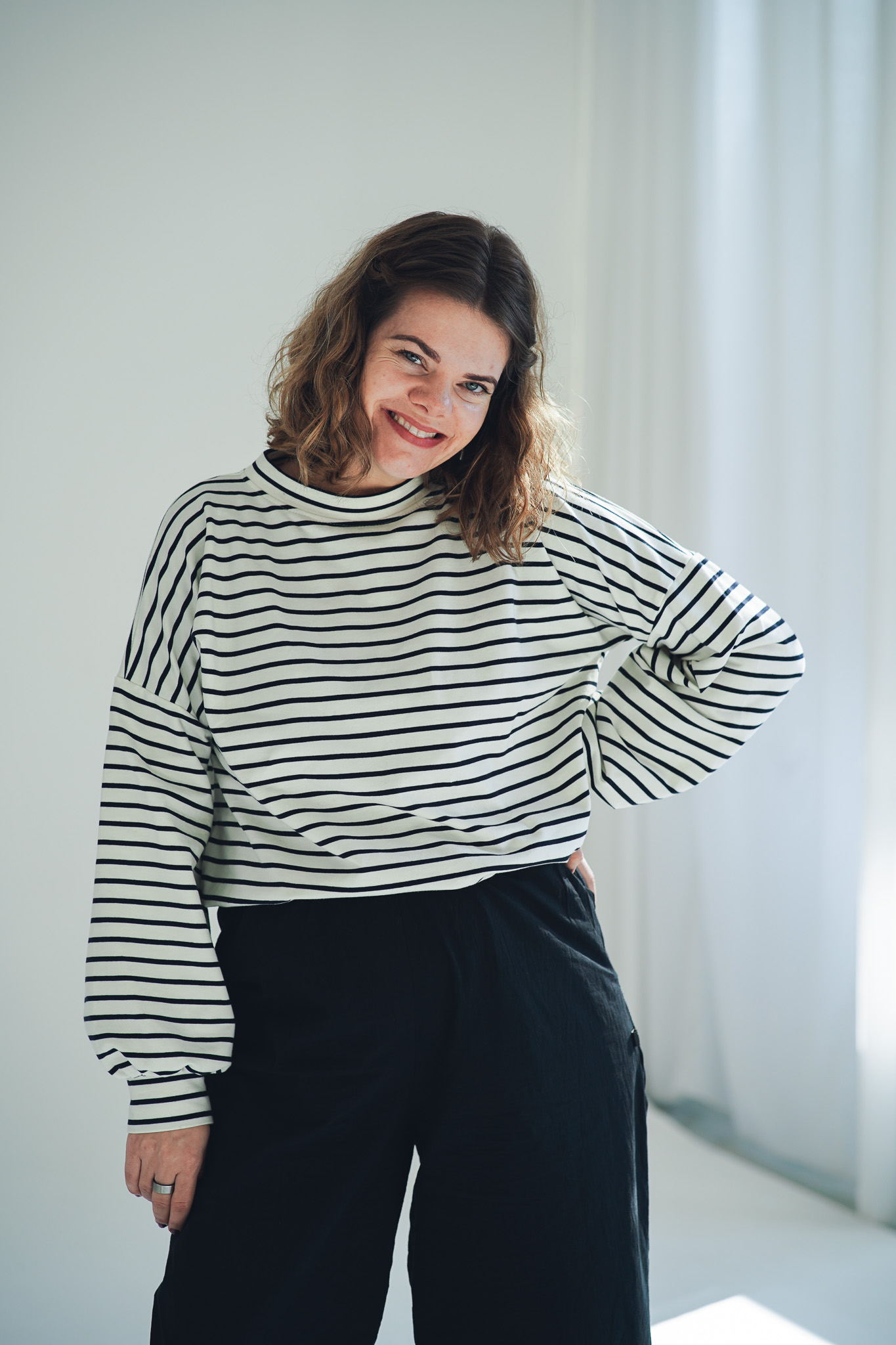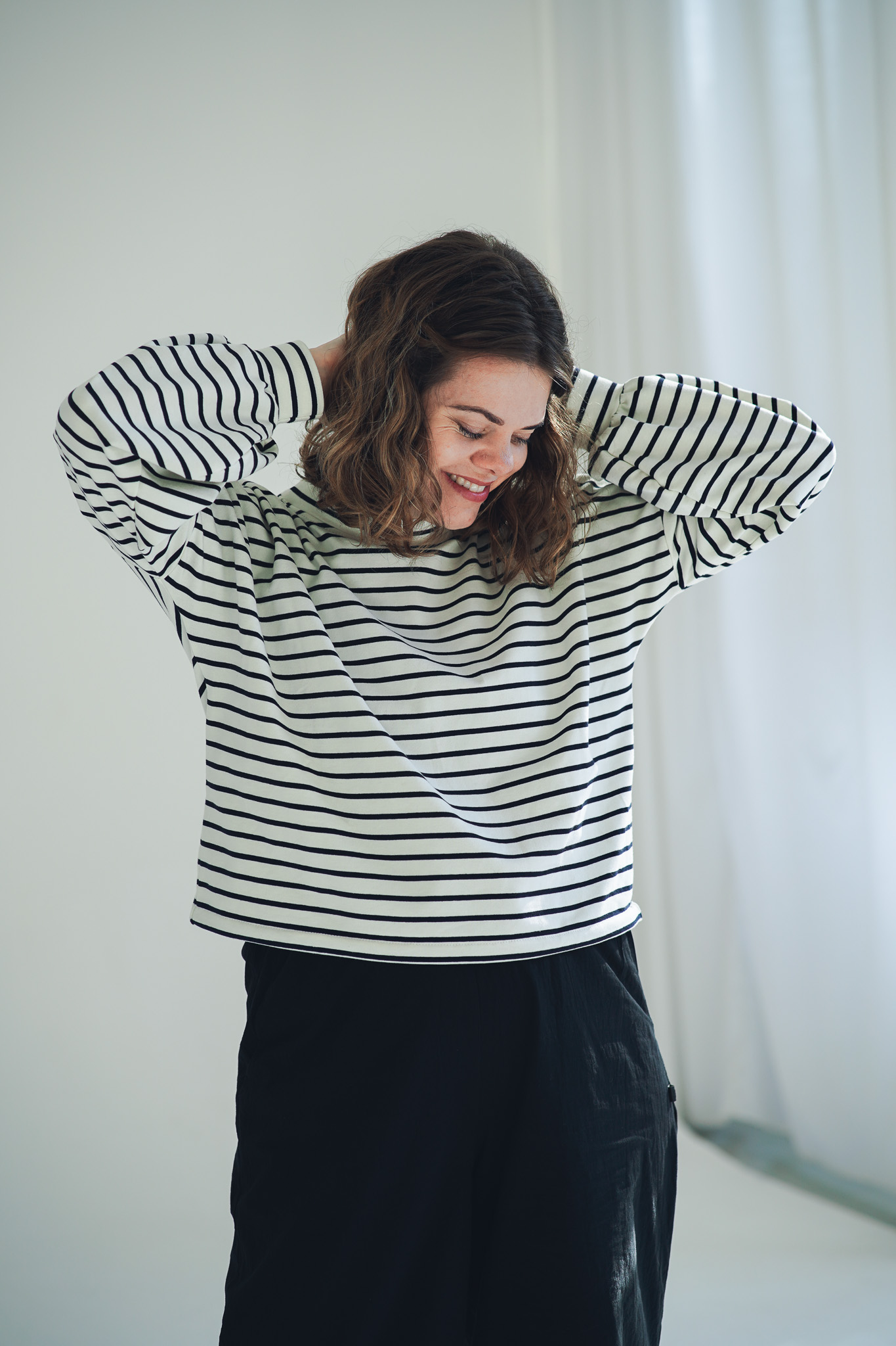 Mikina Fluff ve střihu crop-top s lehce nařasenými rukávy. Mikina má stahování na gumičku, takže ji můžete stáhnout a nařasit nebo nosit volně, rovnou. Skvěle se kombinuje s našimi vestami, ale sluší jí to i s šaty a sukněmi. Naším cílem bylo vytvořit univerzální mikinu, která se dá nosit v různých variantách a bude to základ do vašeho minimalistického šatníku.