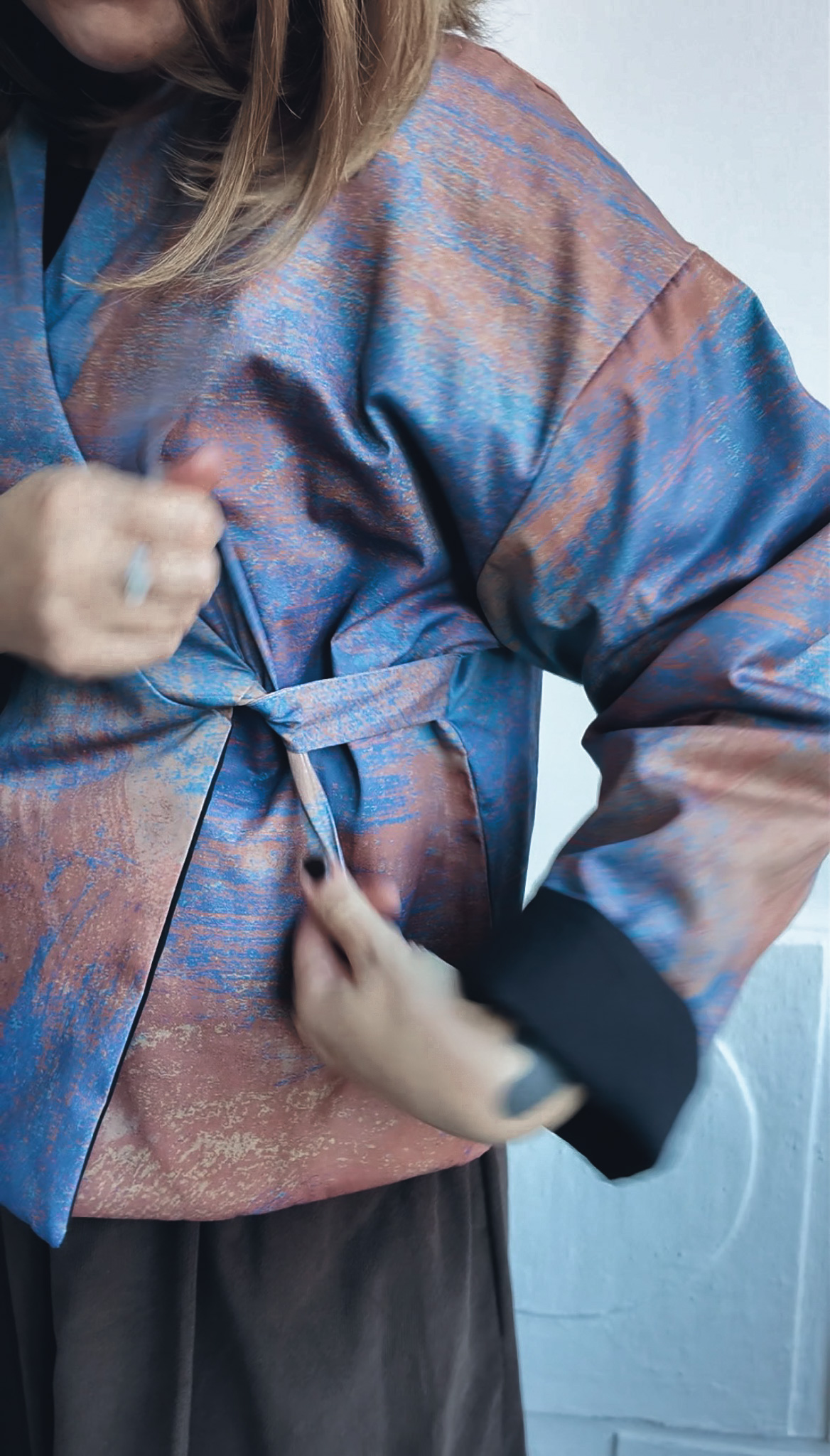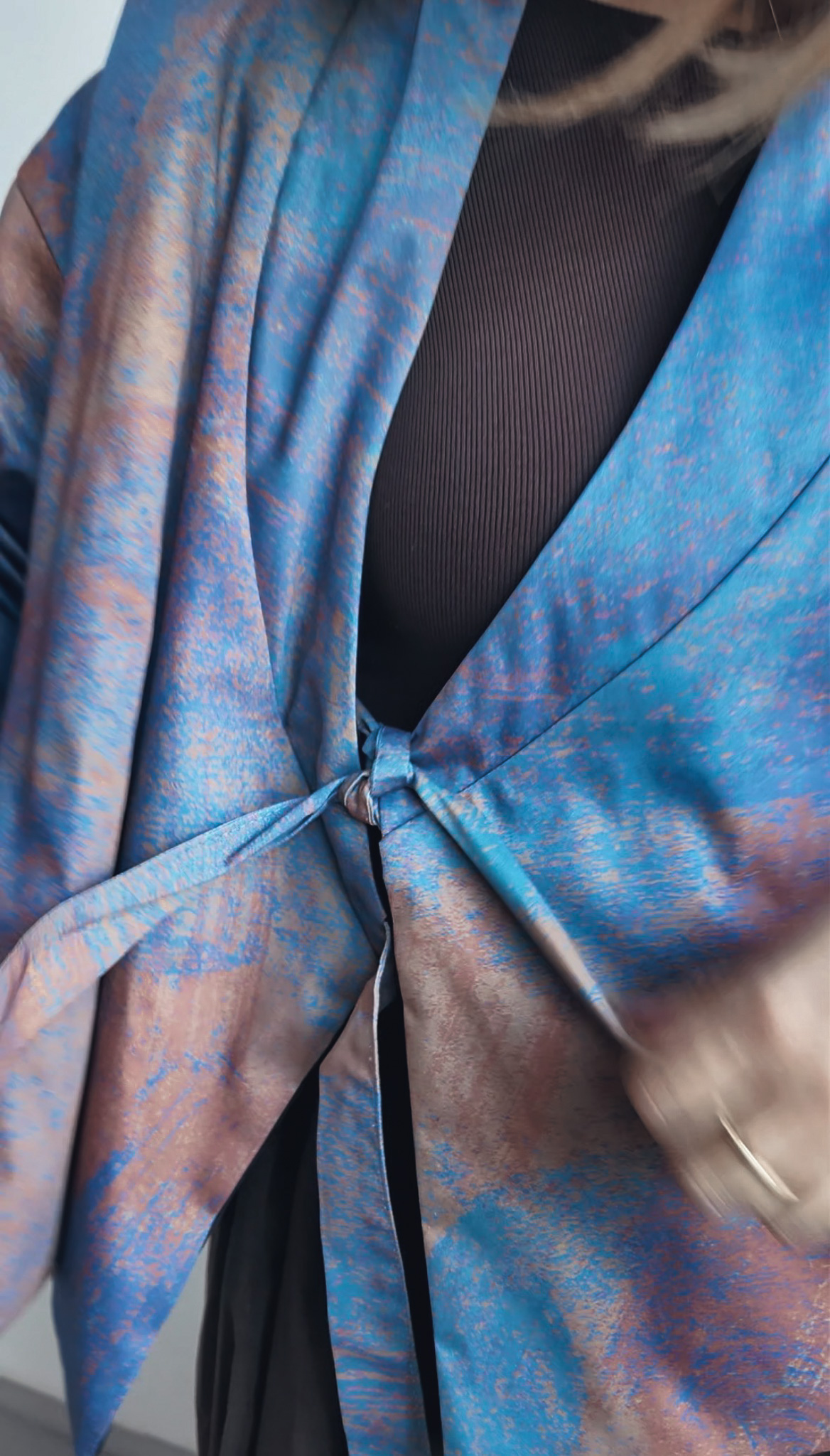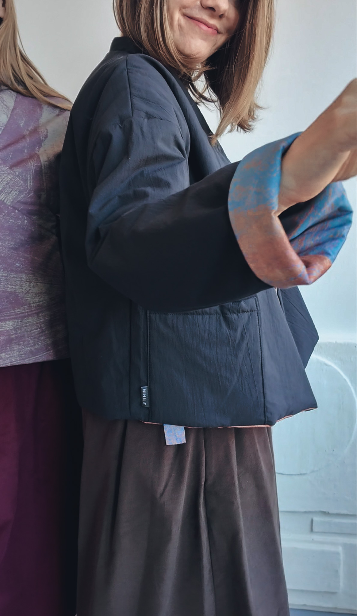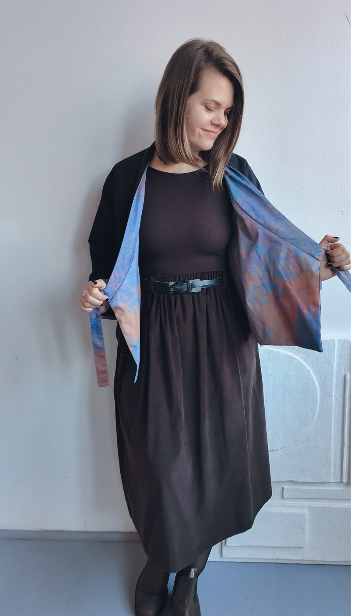 ×Oboustranná one size bunda z limitované autorské látky ve stylu kimona s dlouhými rukávy a zavazováním. Bunda má ze strany motivu dvě skryté kapsy a z jednobarevné strany jednu kapsu. Vypadá skvěle i nezavázaná, efektně vypadají i ohrnuté rukávy. Díky volnějšímu střihu vám v ní bude pohodlně a můžete vrstvit mikiny, svetry, podle počasí.