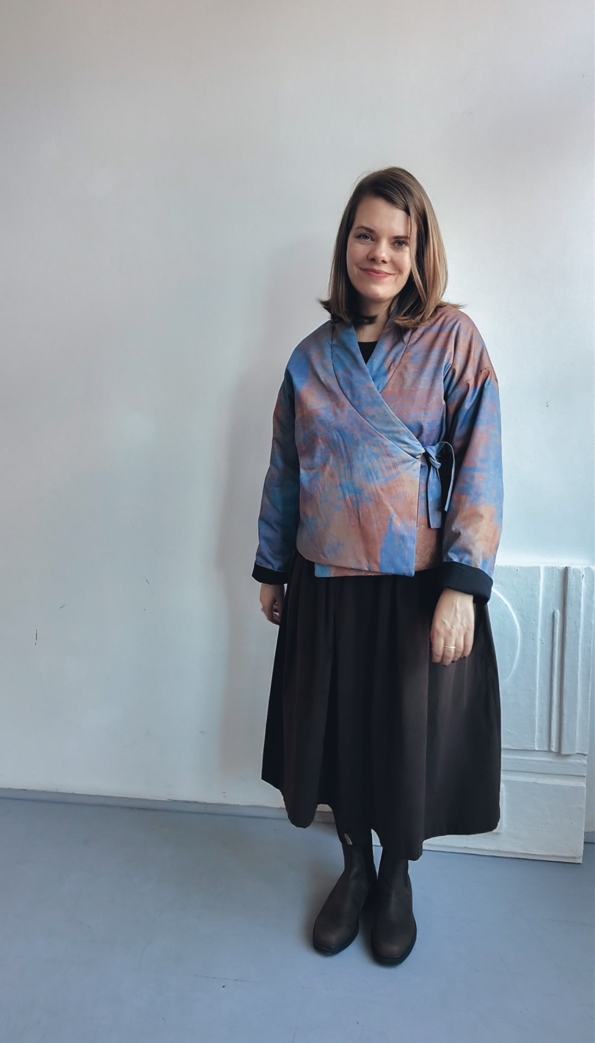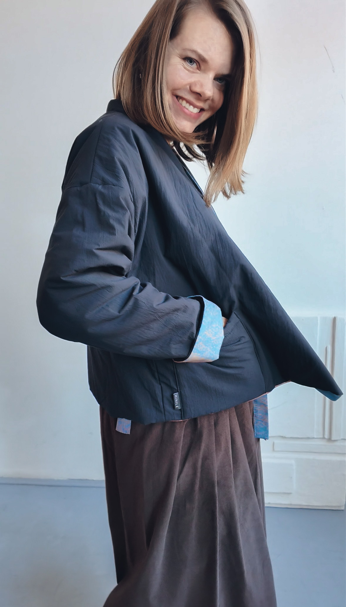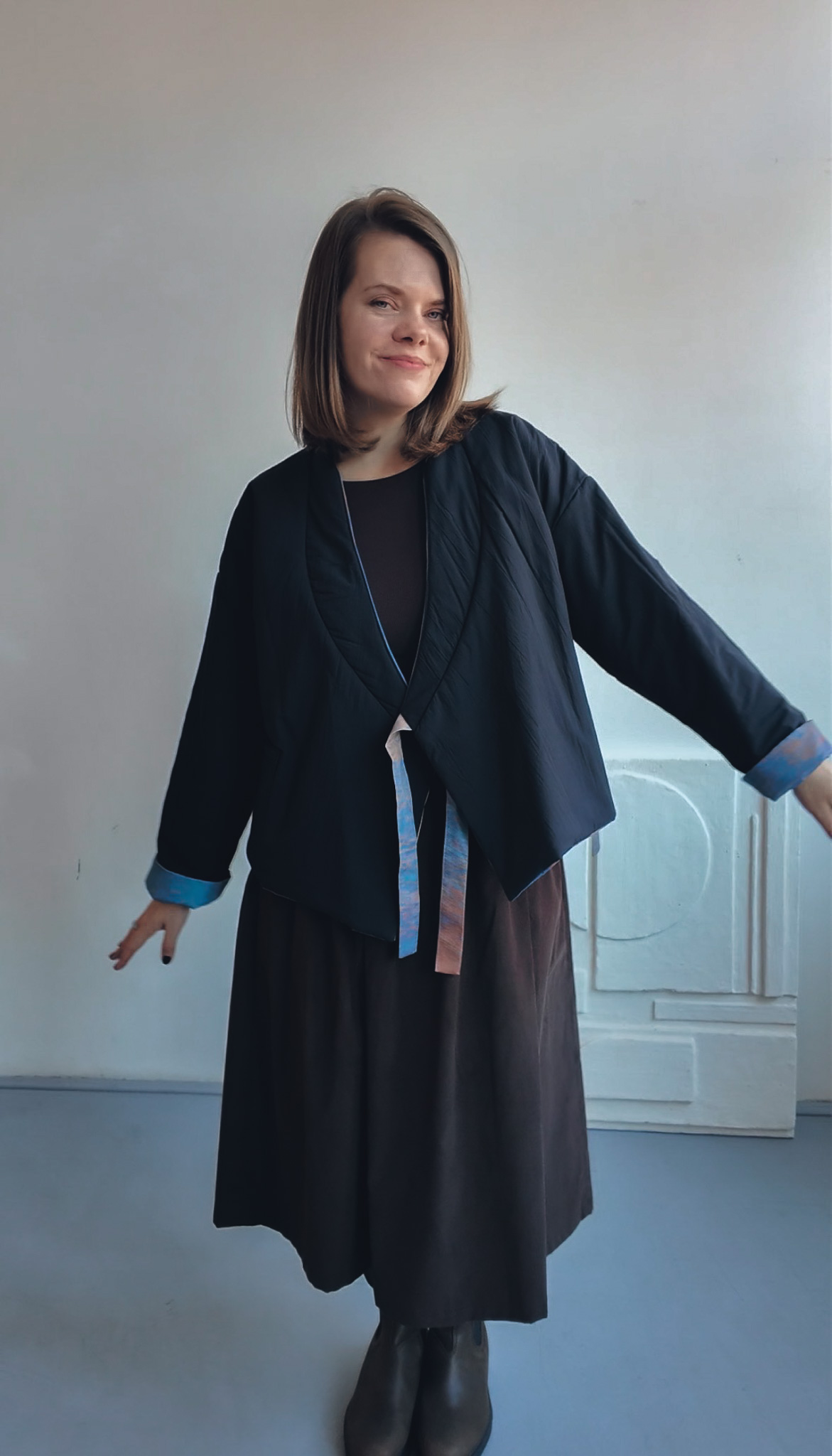 Je to ideální bunda na přechodové období i na mírnou zimu a sluší jí to se sukněmi, s šaty, ale i s kalhoty Culottes a Palazzo. Díky zavazování se s ní dá nosit i miminko v nosítku.