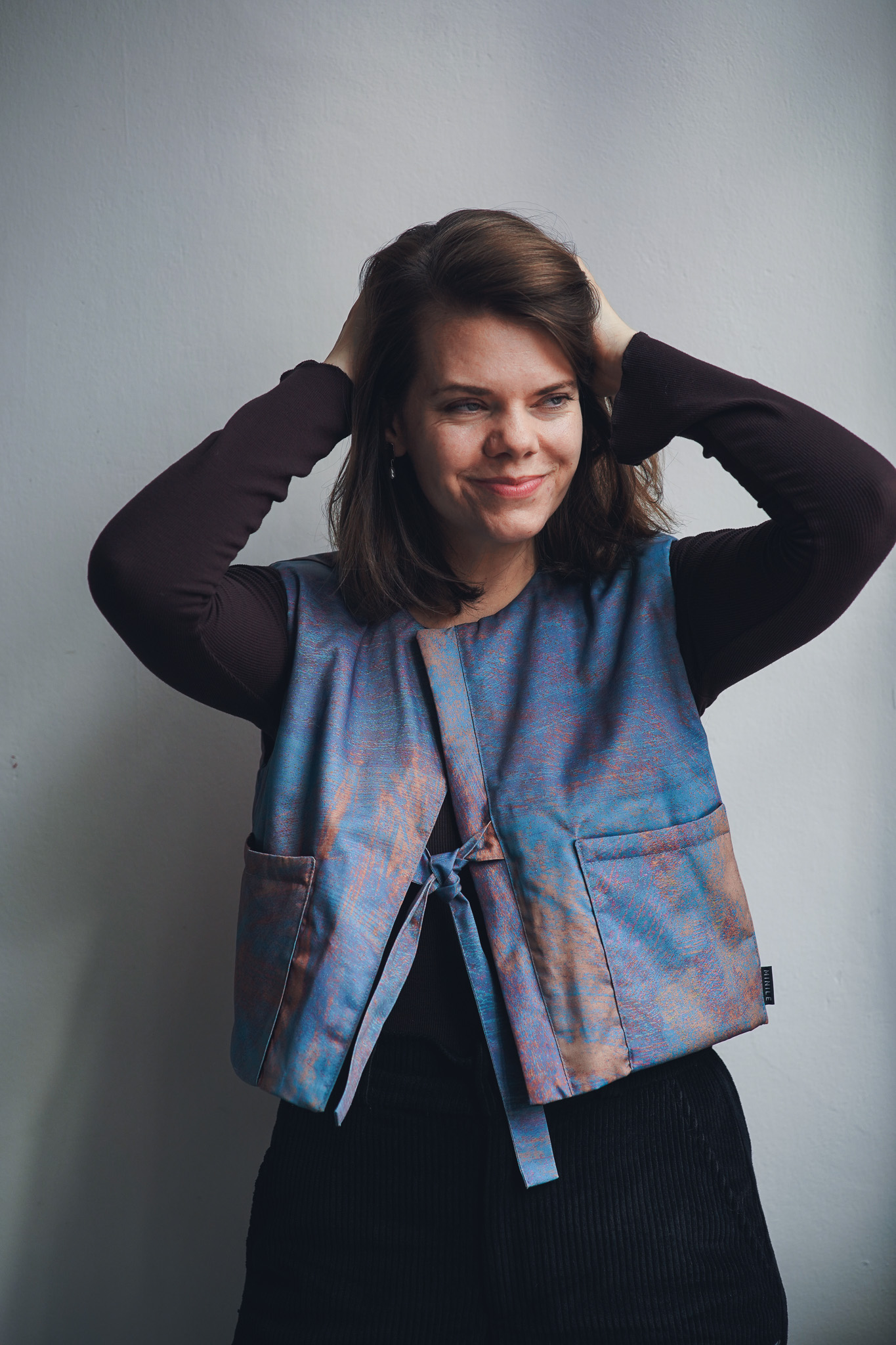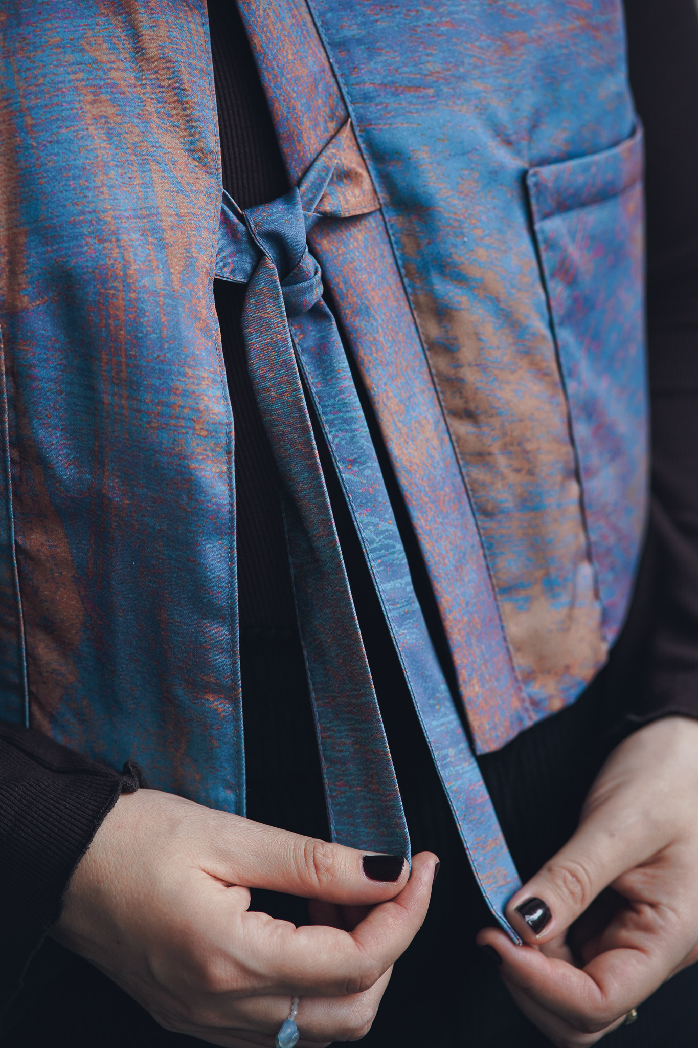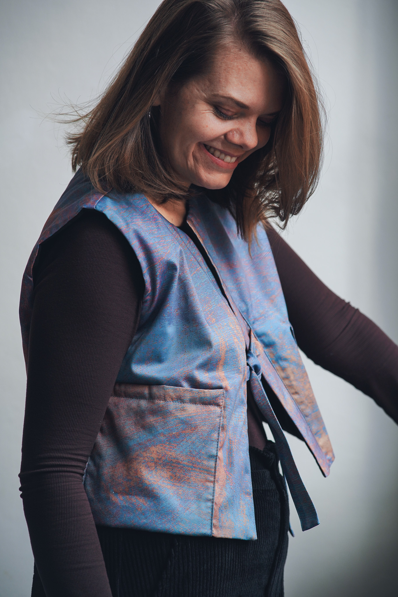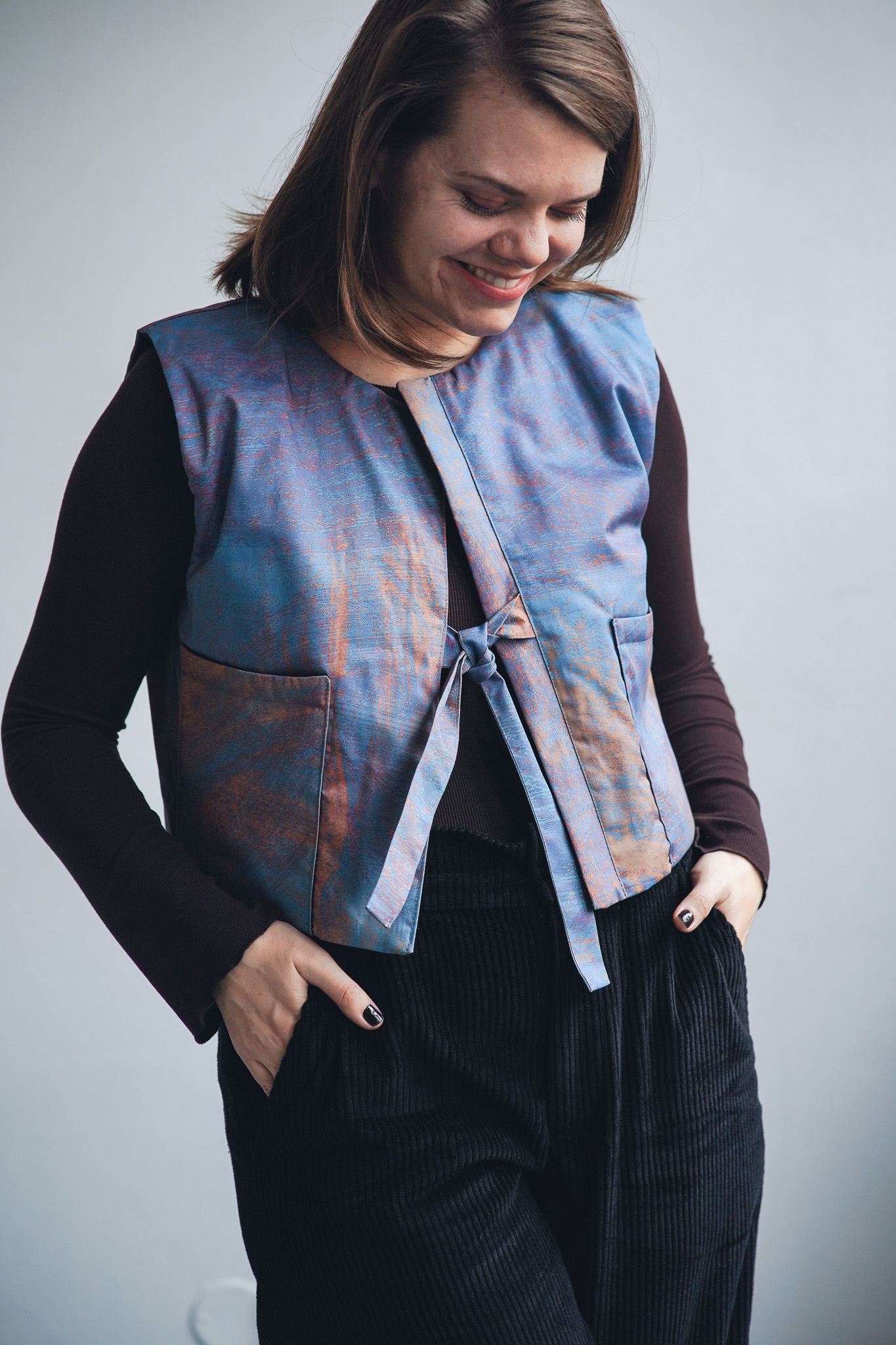 ×Oboustranná vesta z limitované autorské látky se zavazováním. Vesta má ze strany motivu dvě kapsy a z jednobarevné strany je minimalistická bez kapes. Šňůrky jdou schovat do kapes a tak můžete mít i čistou, jednobarevnou vestičku, která se hodí ke všemu. Vesta je ideální i na vrstvení mikin, svetrů, podle počasí.