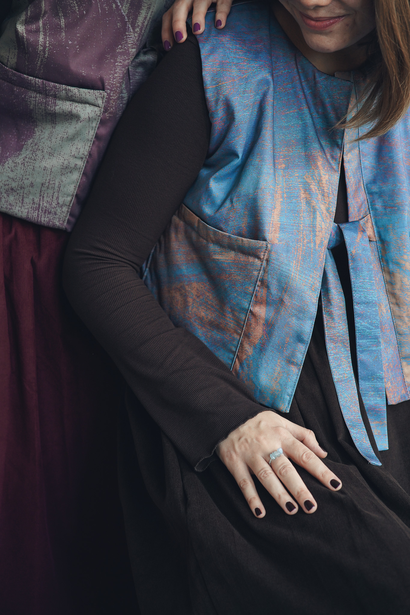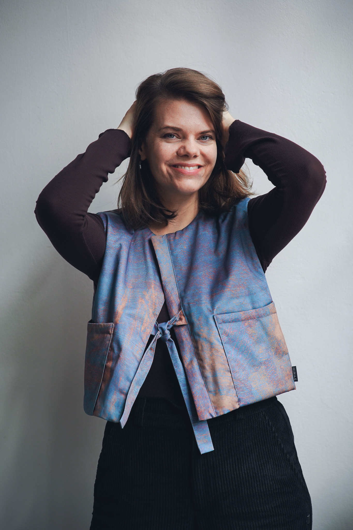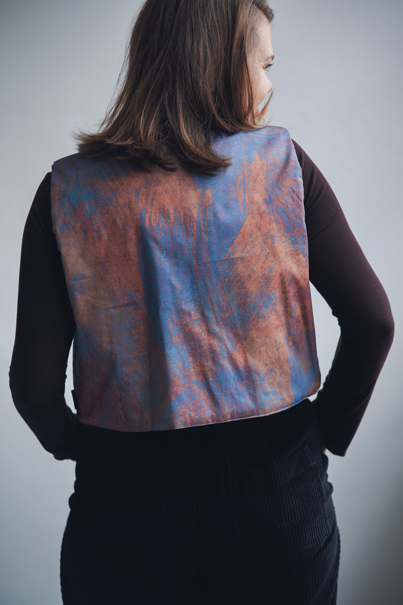 ×Oboustranná vesta z limitované autorské látky se zavazováním. Vesta má ze strany motivu dvě kapsy a z jednobarevné strany je minimalistická bez kapes. Šňůrky jdou schovat do kapes a tak můžete mít i čistou, jednobarevnou vestičku, která se hodí ke všemu. Vesta je ideální i na vrstvení mikin, svetrů, podle počasí.