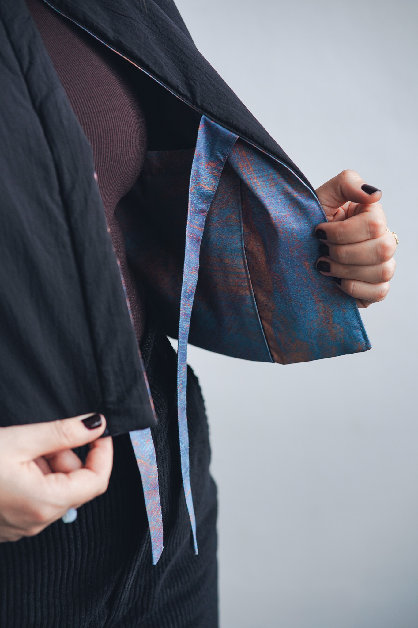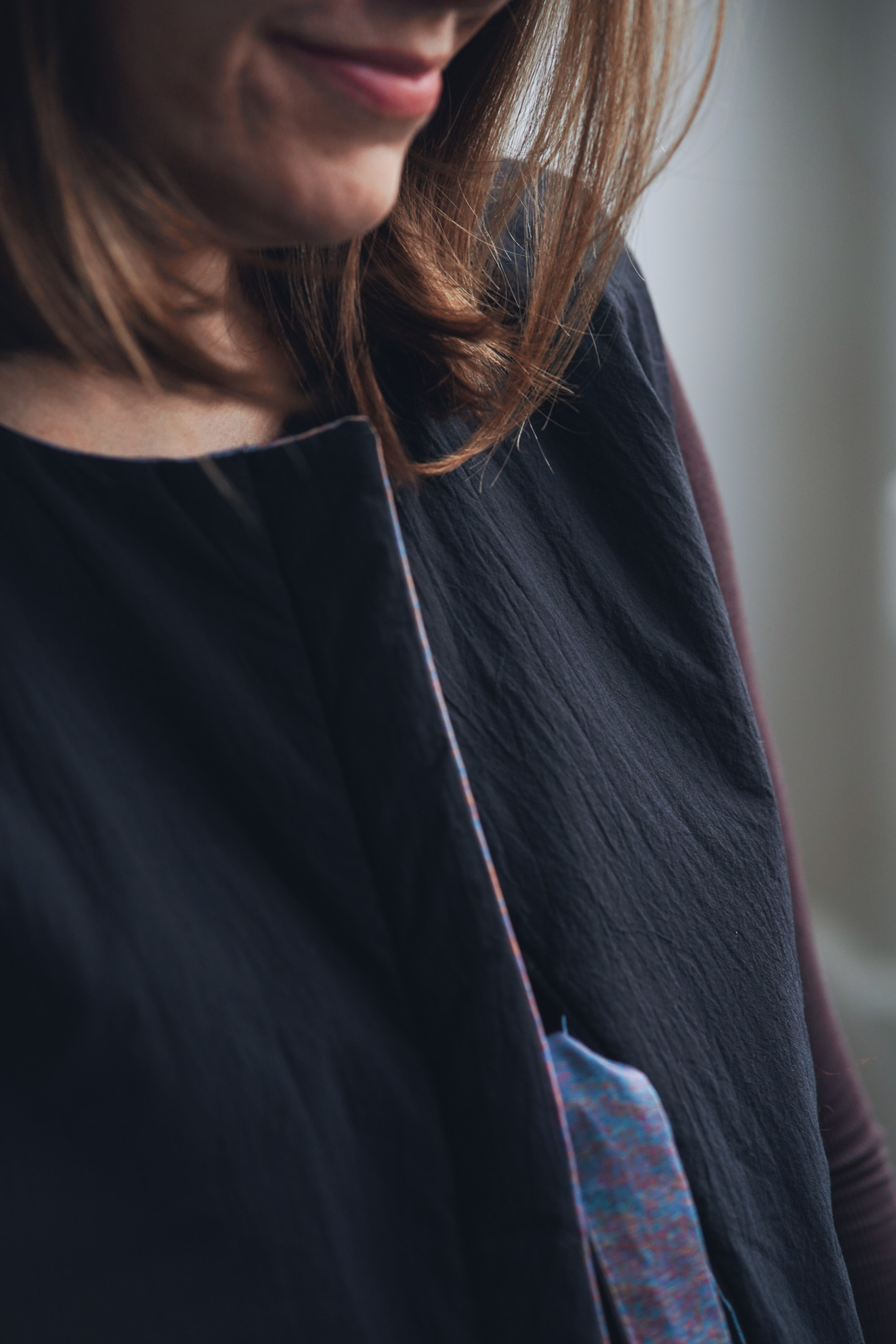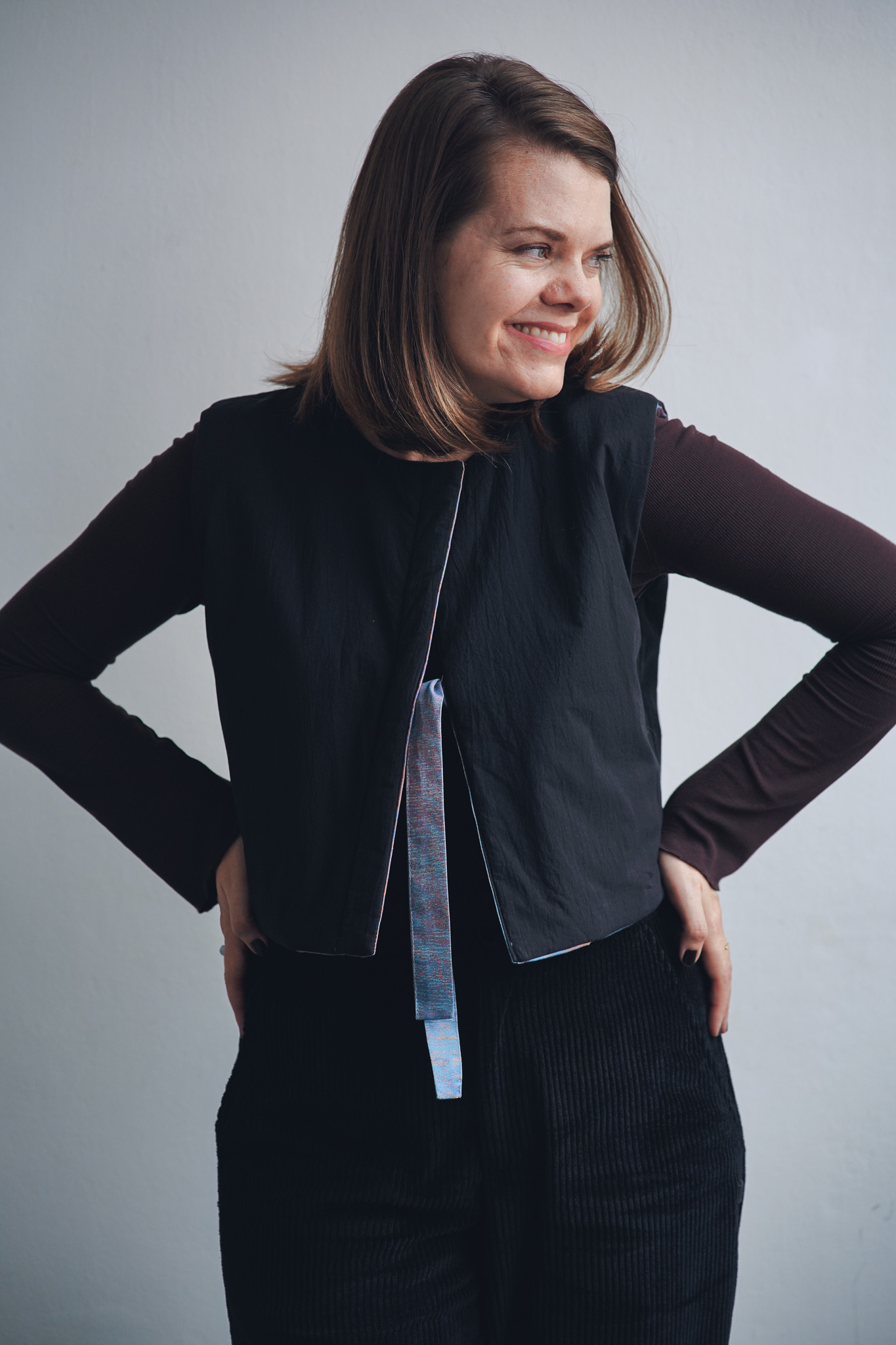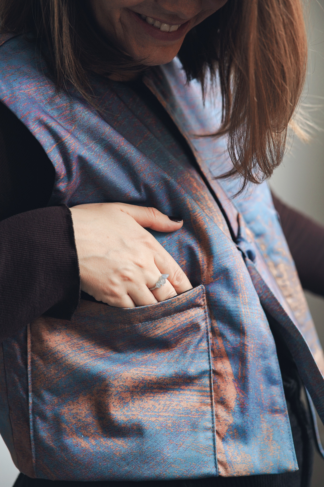 ×Oboustranná vesta z limitované autorské látky se zavazováním. Vesta má ze strany motivu dvě kapsy a z jednobarevné strany je minimalistická bez kapes. Šňůrky jdou schovat do kapes a tak můžete mít i čistou, jednobarevnou vestičku, která se hodí ke všemu. Vesta je ideální i na vrstvení mikin, svetrů, podle počasí.