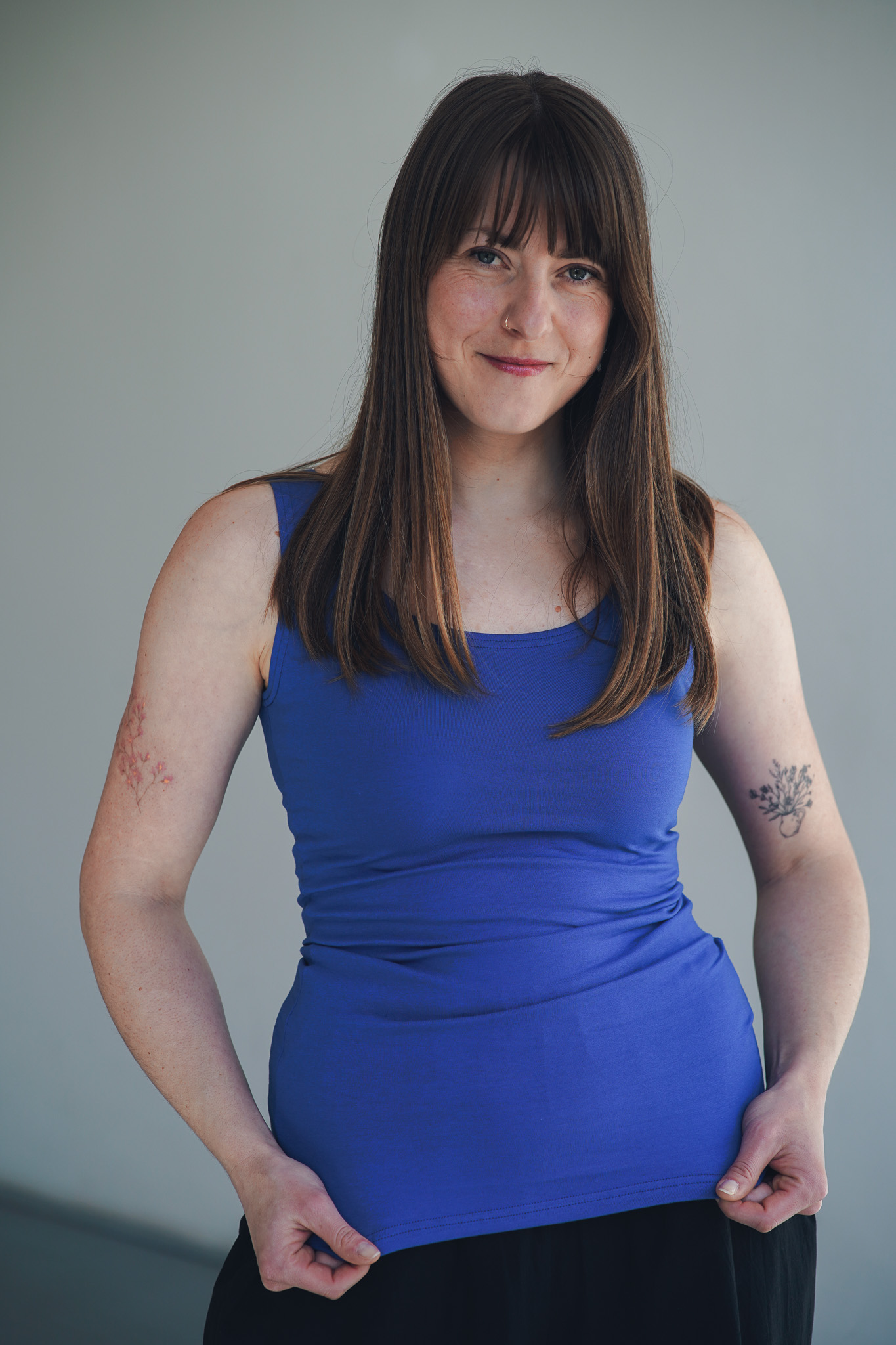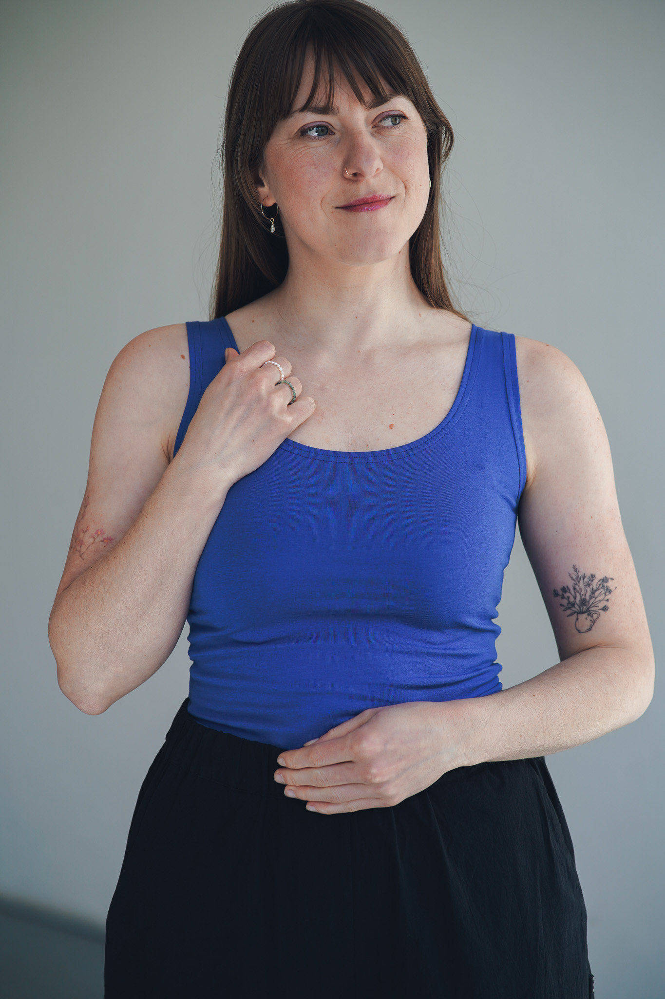 Oboustranné tílko, které můžete nosit výstřihem dopředu či dozadu. Když dáte výstřih dozadu, budete mít krásný lodičkový výstřih. Tričko vypadá elegantně, je ušito z pohodlného bavlněného úpletu, který obstojí při každé příležitosti.