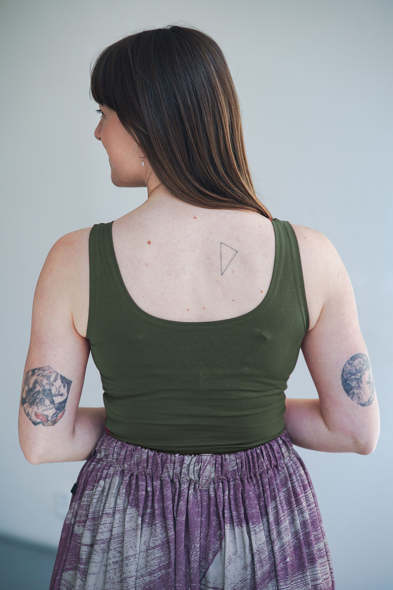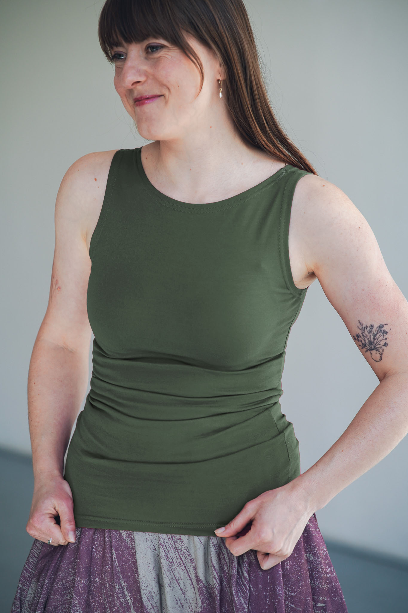 Oboustranné tílko, které můžete nosit výstřihem dopředu či dozadu. Když dáte výstřih dozadu, budete mít krásný lodičkový výstřih. Tričko vypadá elegantně, je ušito z pohodlného bavlněného úpletu, který obstojí při každé příležitosti.