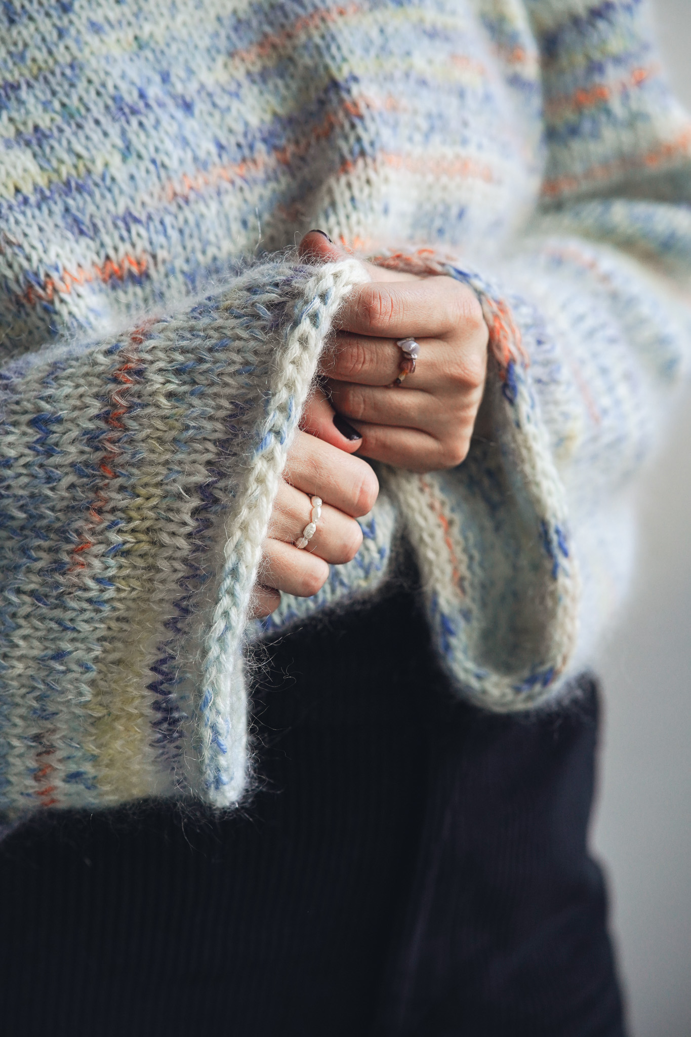 ×Ručně pletený svetr se širokými rukávy z luxusní směsi vlny, mohéru a morušového hedvábí je kousek, který rozzáří každý outfit. Je lehoučký, jemný na dotek a hřejivý. Svetr je pletený ze tří přízí – 1 příze vlny a 2 příze mohéru.