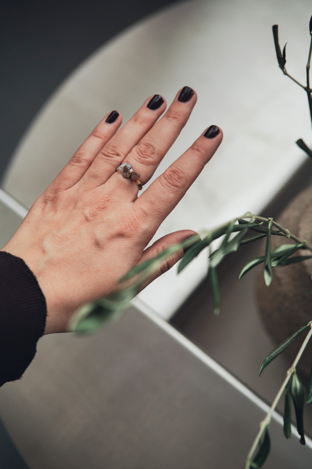 Prstýnek z minerálních kamenů na gumičce, který se přizpůsobí každému prstu. Šperk je vytvořen z několika větších a dále menších achátů Botswana. Prstýnek se může mírně lišit od fotografie dle dostupných kamenů.