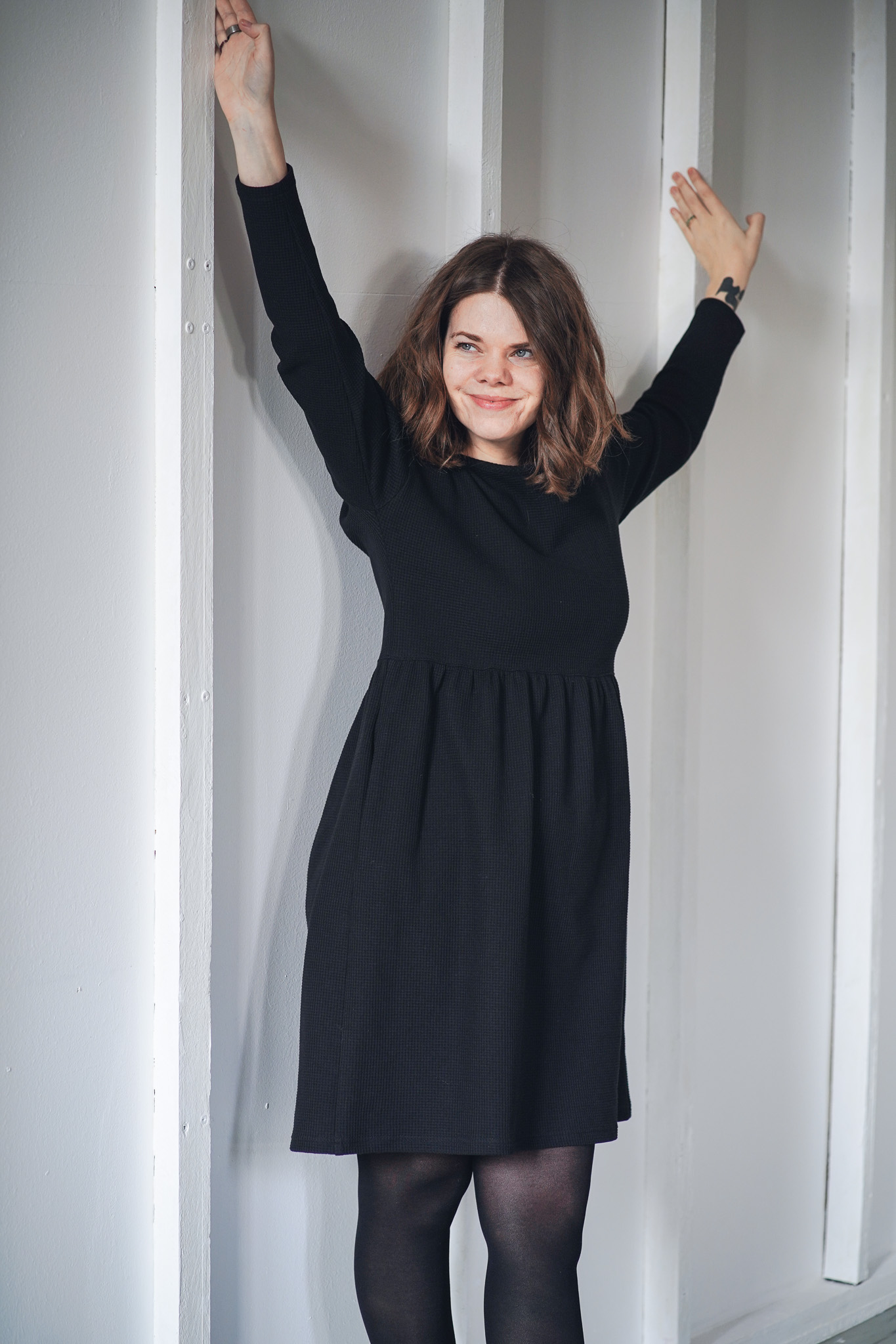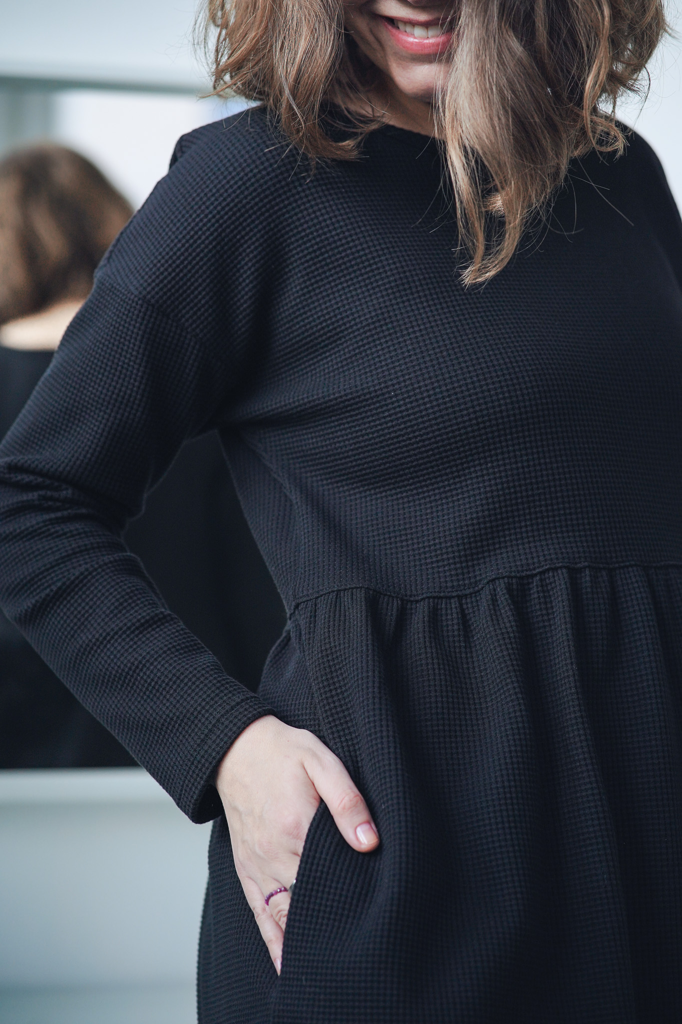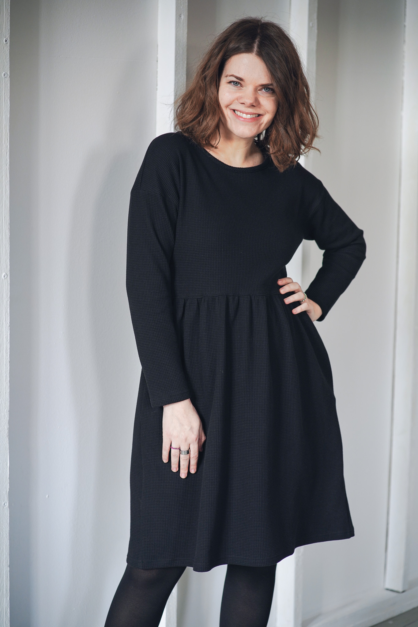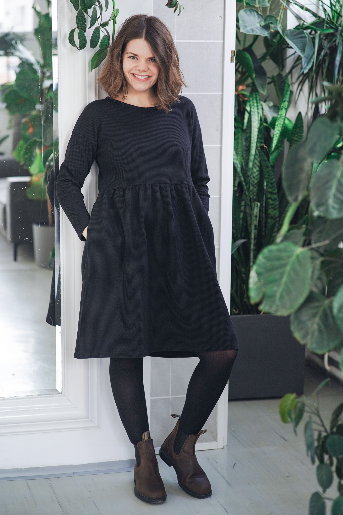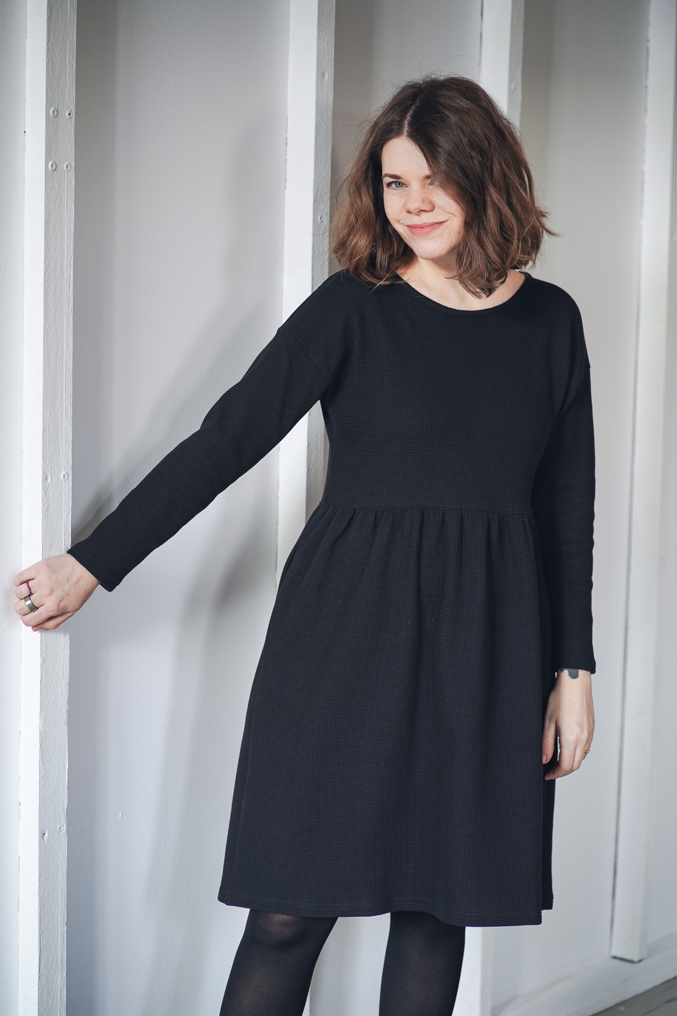 ׊aty New Wafle jsou ušité z velmi příjemné a hřejivé bavlny – vafloviny a jsou ideální pro chladnější dny. Jsou inspirované našimi původními oboustrannými šaty Wafle, ale tyto jsou jednostranné a mají jemný kulatý výstřih. Nechybí jim samozřejmě praktické kapsy a sluší jim to i se všemi našimi koženými pásky. Jsou velmi slušivé, pohodlné, sedí spoustě typům postav. Šaty vychází ze střihu našich nejprodávanějších šatů Simple, ale kvůli elastanu ve vaflovině doporučujeme objednat o číslo menší velikost, než nosíte u právě našich šatů Simple z mušelínu.