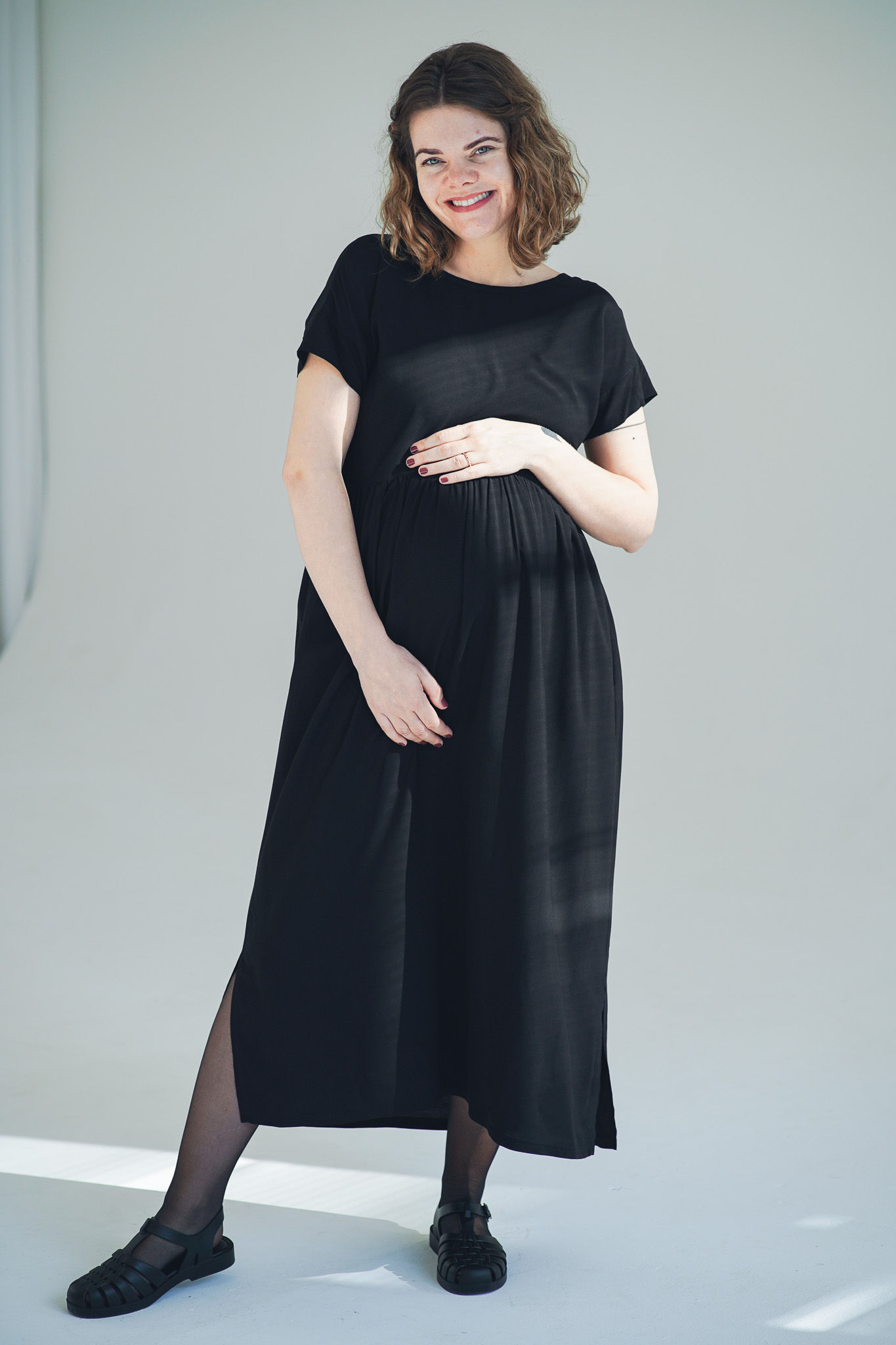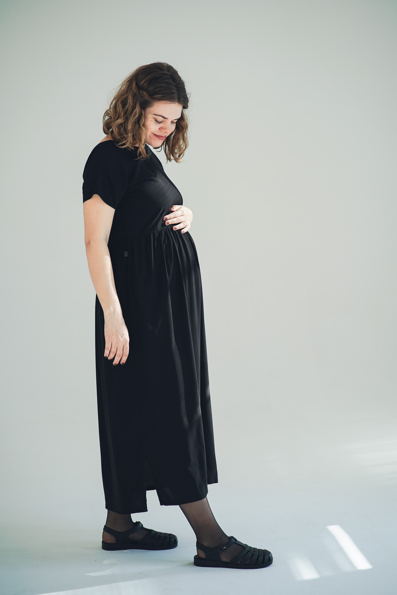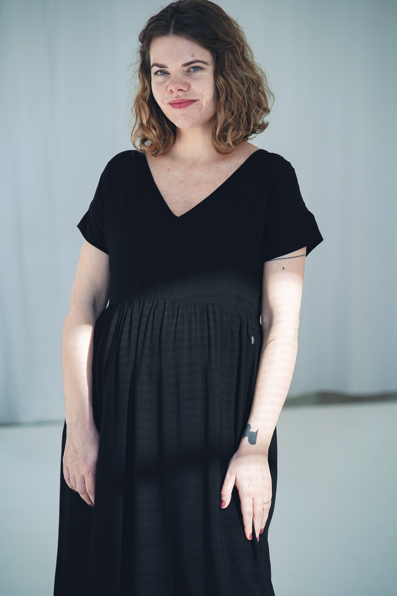 Modelce nejlépe sedí velikost M, je v 5.měsící těhotenství a měří 167 cm.