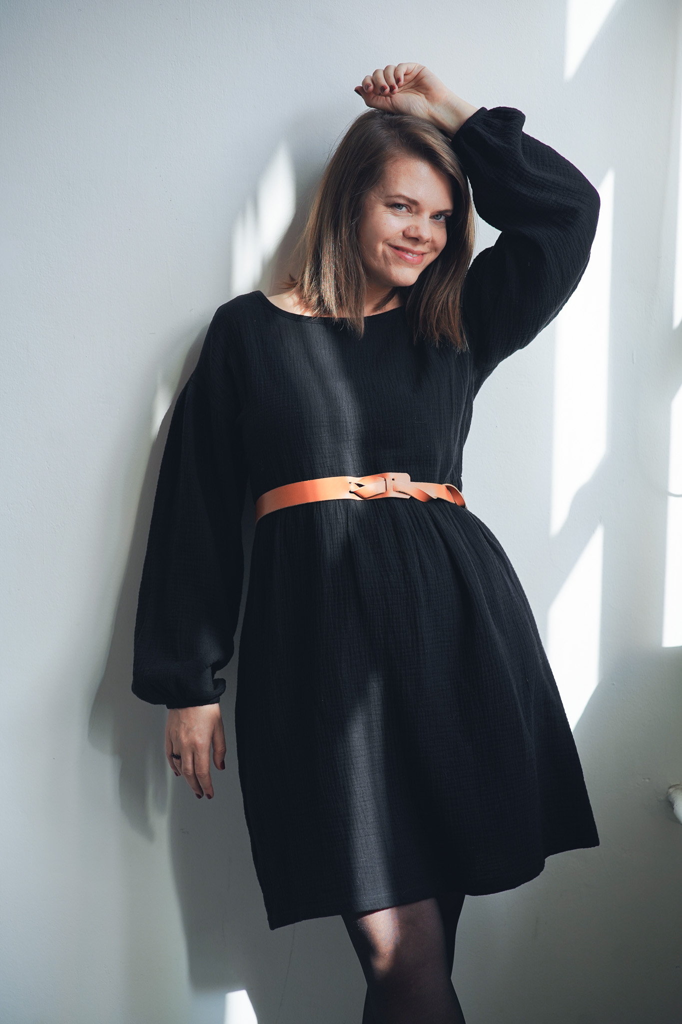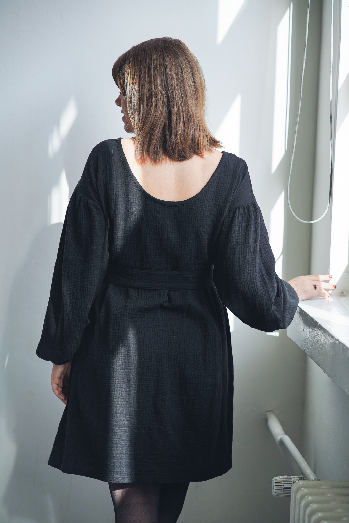 Šaty střihu Simple s kulatým výstřihem, dlouhými balonovými rukávy, kde neškrtí žádná gumička a nově i s páskem, jsou ušité z velmi příjemného mušelínu. Simple jsou naše nejprodávanější šaty, které sedí spoustě typům postav a sluší jim to i s koženými pásky. Šaty můžete nosit celoročně z obou stran, podle vaší nálady s výstřihem dopředu nebo dozadu. Jsou velmi slušivé, pohodlné a nechybí jim ani praktické kapsy. Pokud váháte s velikostí, volte vaši standardní konfekční velikost.