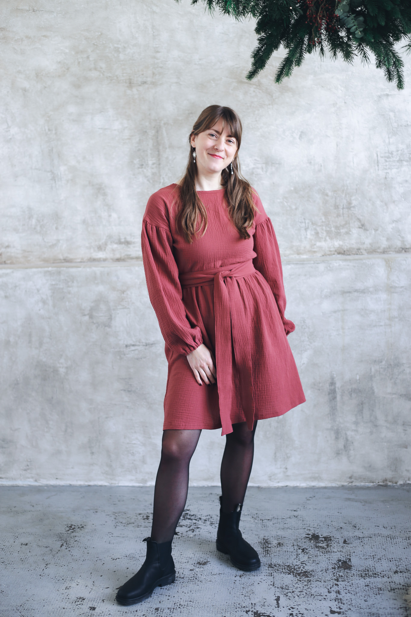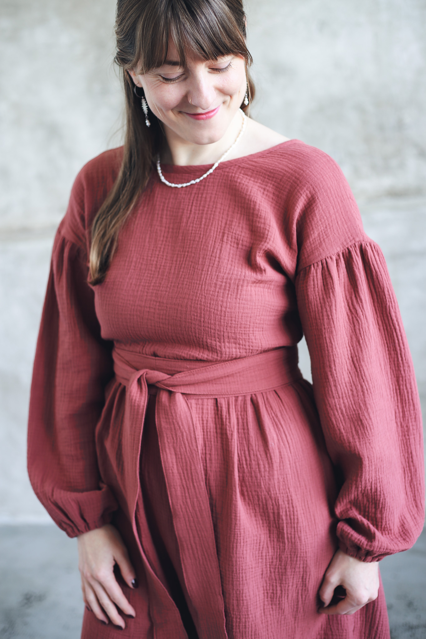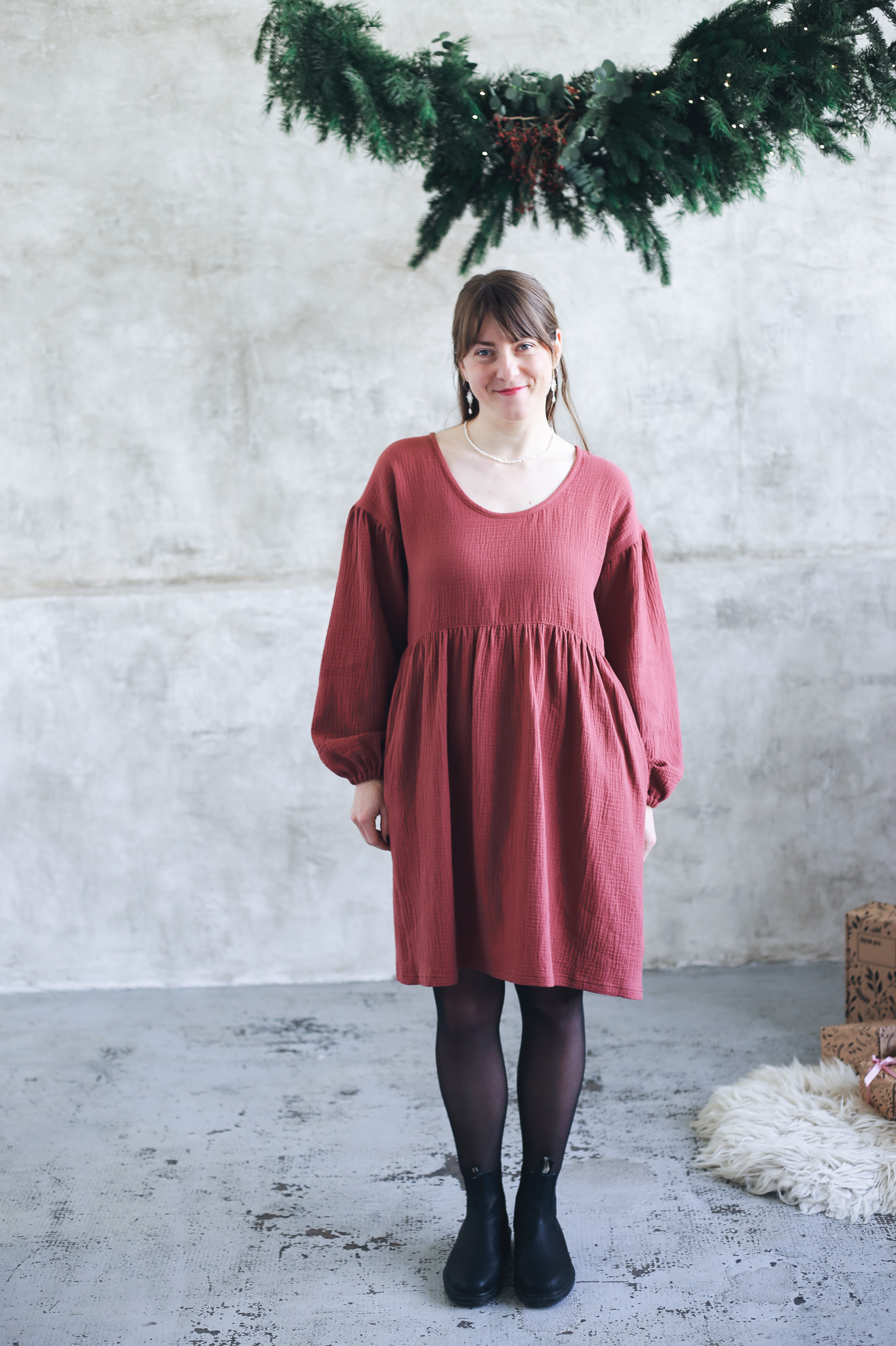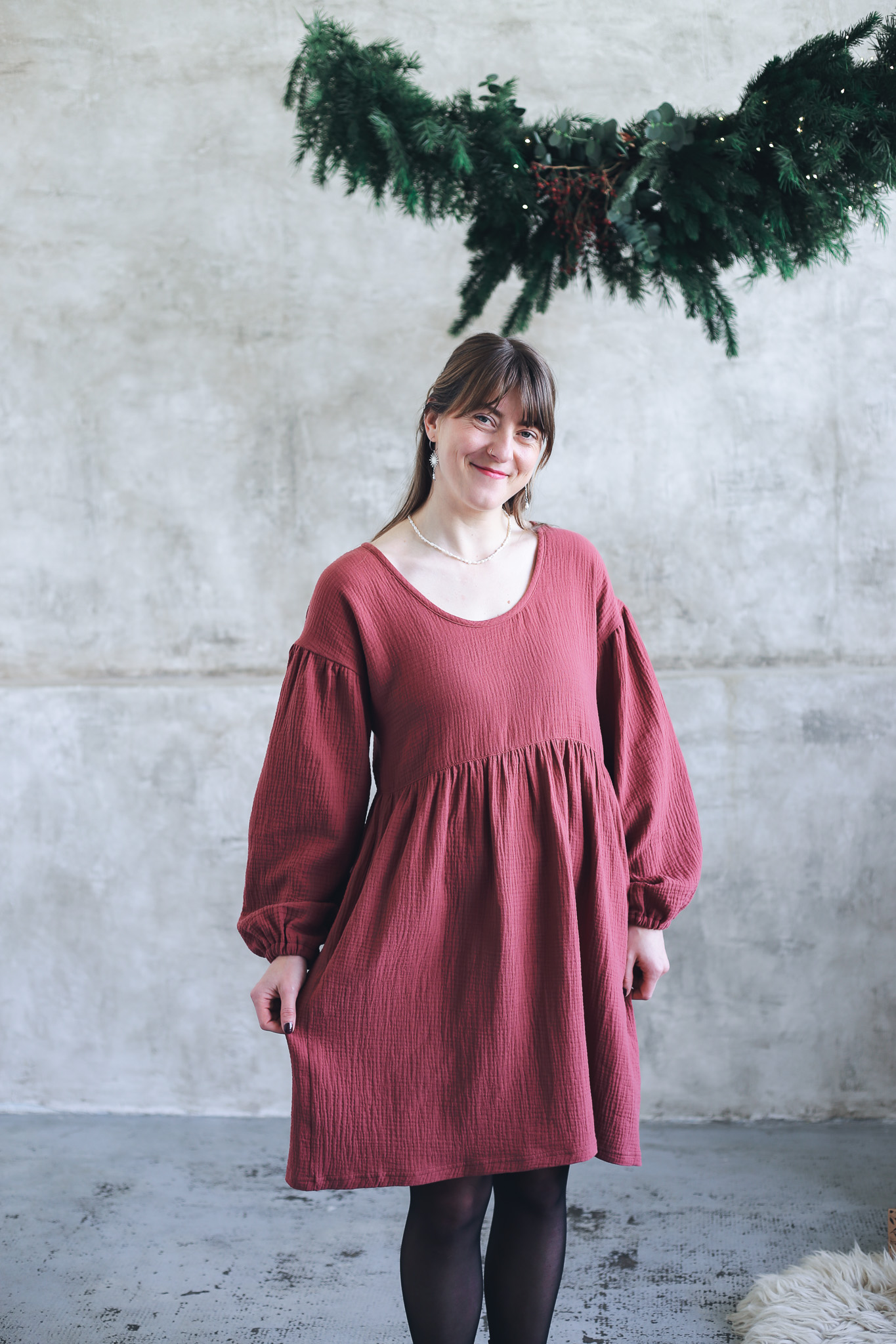 Šaty střihu Simple s kulatým výstřihem, dlouhými balonovými rukávy, kde neškrtí žádná gumička a nově i s páskem, jsou ušité z velmi příjemného mušelínu. Simple jsou naše nejprodávanější šaty, které sedí spoustě typům postav a sluší jim to i s koženými pásky. Šaty můžete nosit celoročně z obou stran, podle vaší nálady s výstřihem dopředu nebo dozadu. Jsou velmi slušivé, pohodlné a nechybí jim ani praktické kapsy. Pokud váháte s velikostí, volte vaši standardní konfekční velikost.