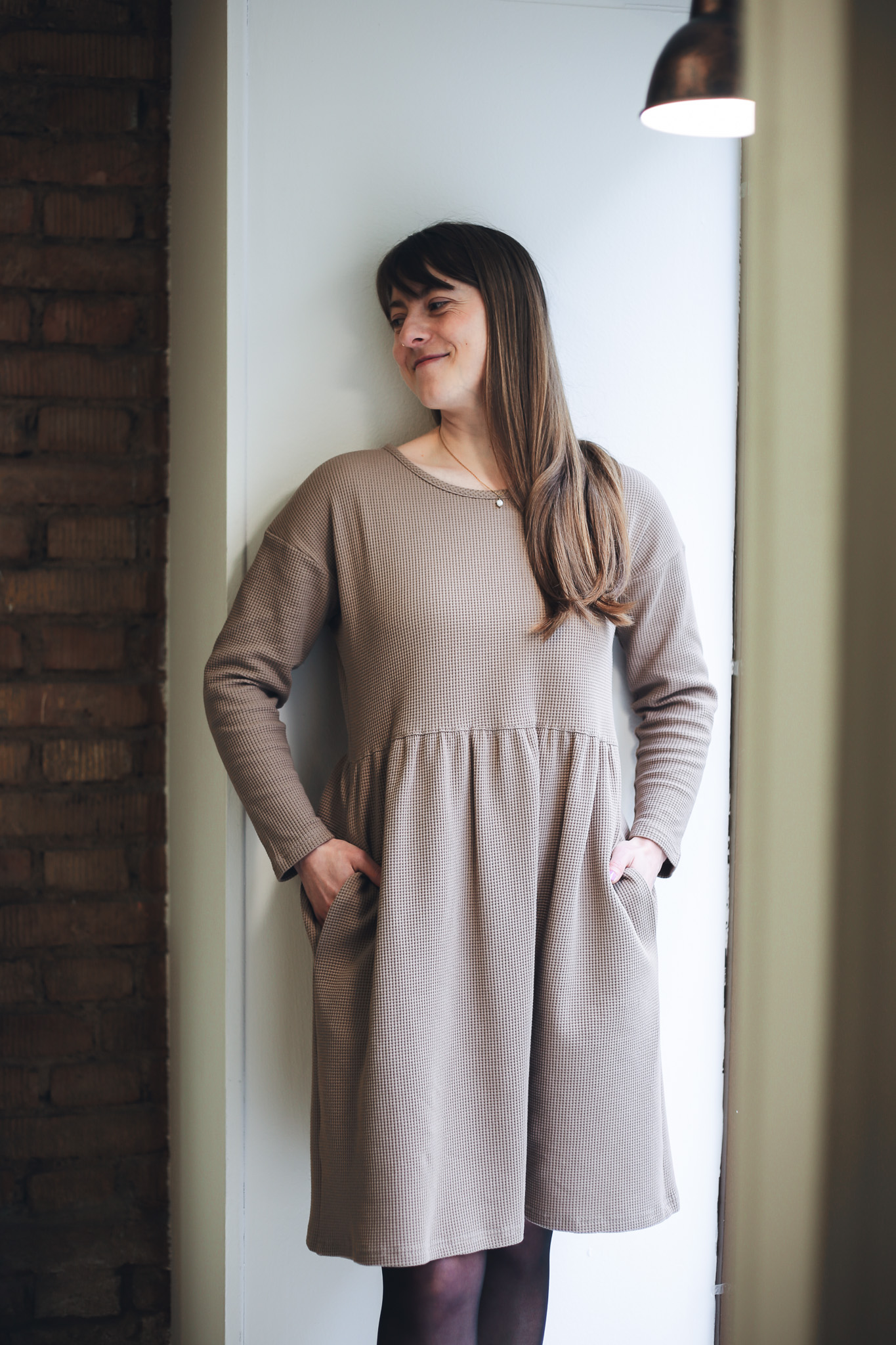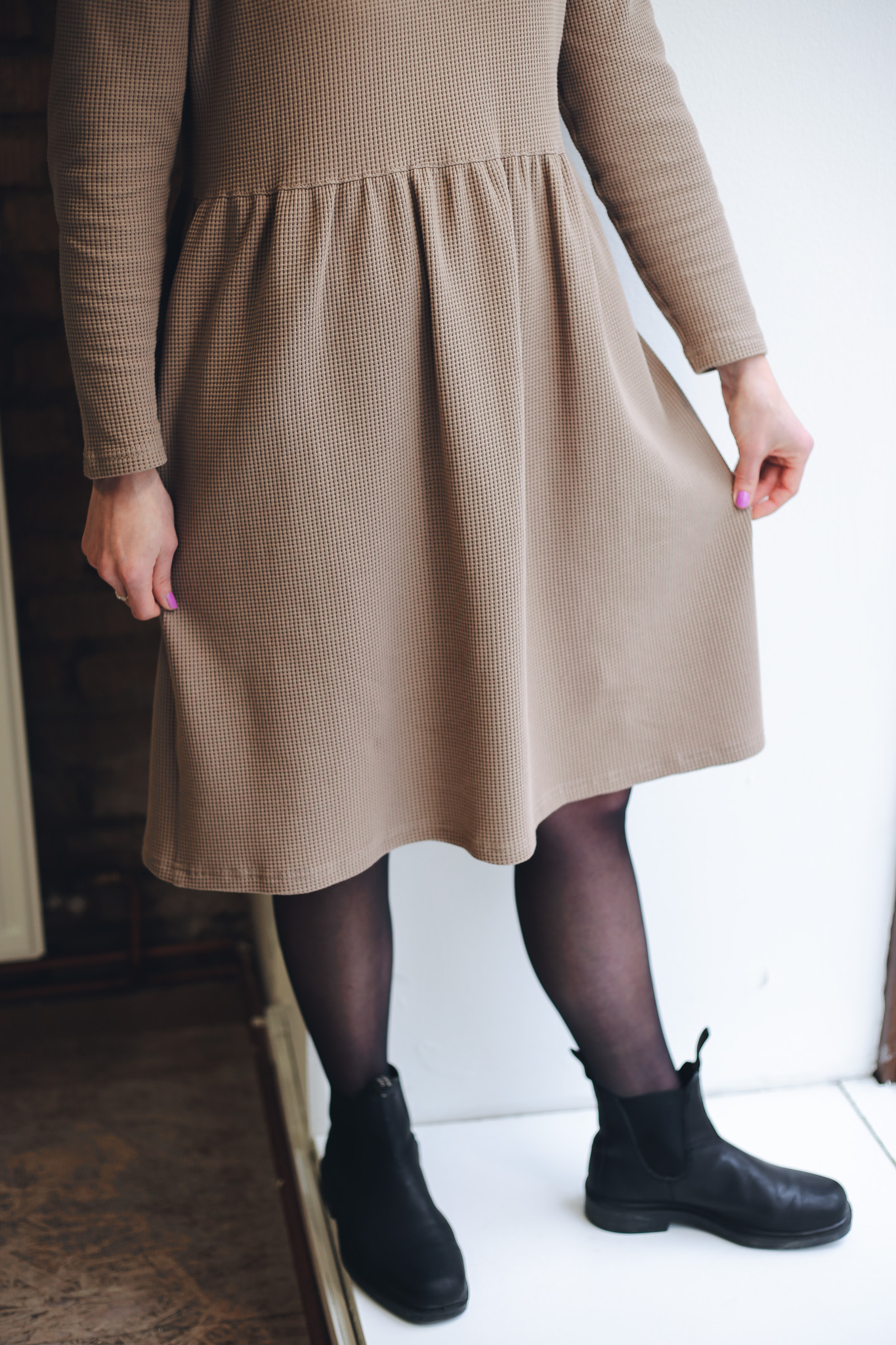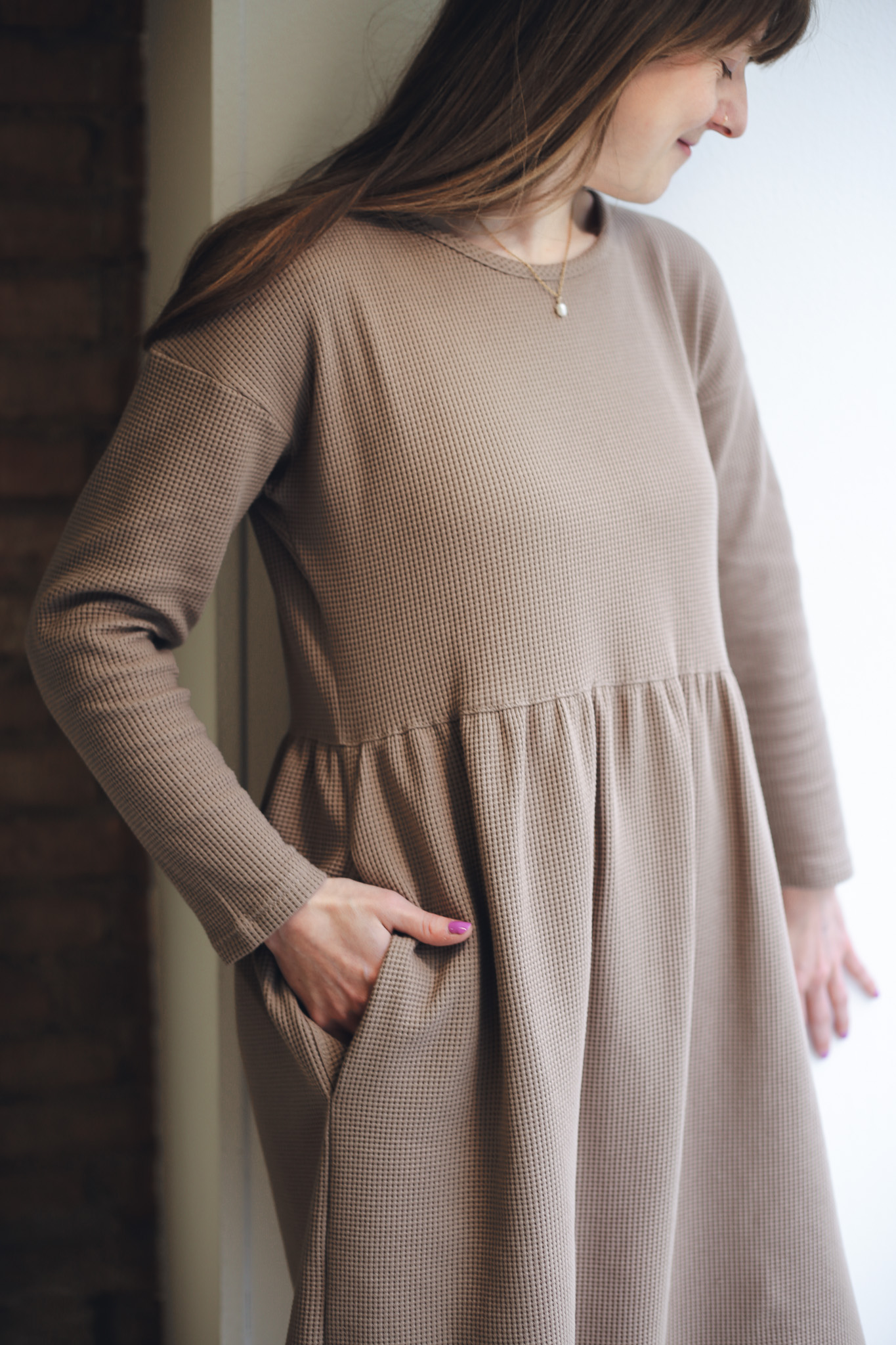 ׊aty Wafle jsou ušité z velmi příjemné a hřejivé bavlny – vafloviny a jsou ideální pro chladnější dny. Jsou inspirované našimi původními oboustrannými šaty Wafle, ale tyto jsou jednostranné, mají jemný kulatý výstřih a dlouhý rukáv. Nechybí jim samozřejmě praktické kapsy a sluší jim to i se všemi našimi koženými pásky. Jsou velmi slušivé, pohodlné, sedí spoustě typům postav. Šaty vychází ze střihu našich nejprodávanějších šatů Simple, ale kvůli elastanu ve vaflovině doporučujeme objednat o číslo menší velikost, než nosíte u právě našich šatů Simple z mušelínu.