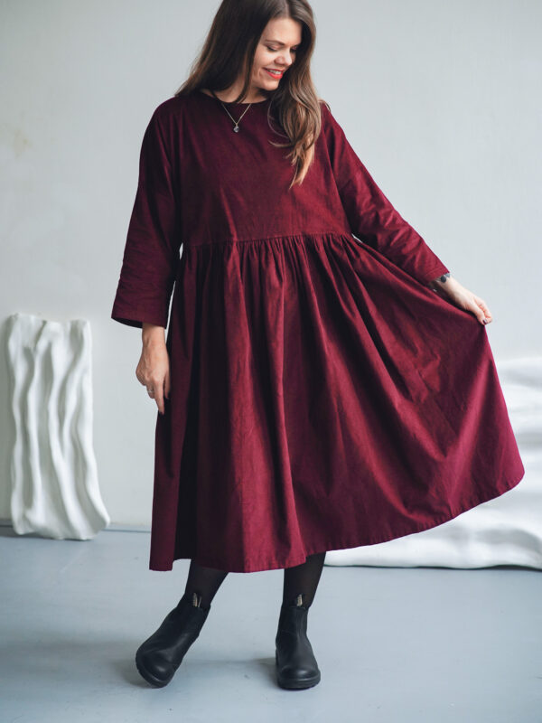 Šaty Wide jsou volné šaty pouze v jedné velikosti, tyto jsou ušité z bavlněného manšestru, který je ideální na chladnější dny. Mají opravdu bohatou sukni, 7/8 spadený rukáv, který lze snadno ohrnout a na zádech malé zapínání na knoflíček. Šaty lze skvěle kombinovat s vestičkami, vrstvit s tričkem Roll, s merino košilkou či s legíny.
