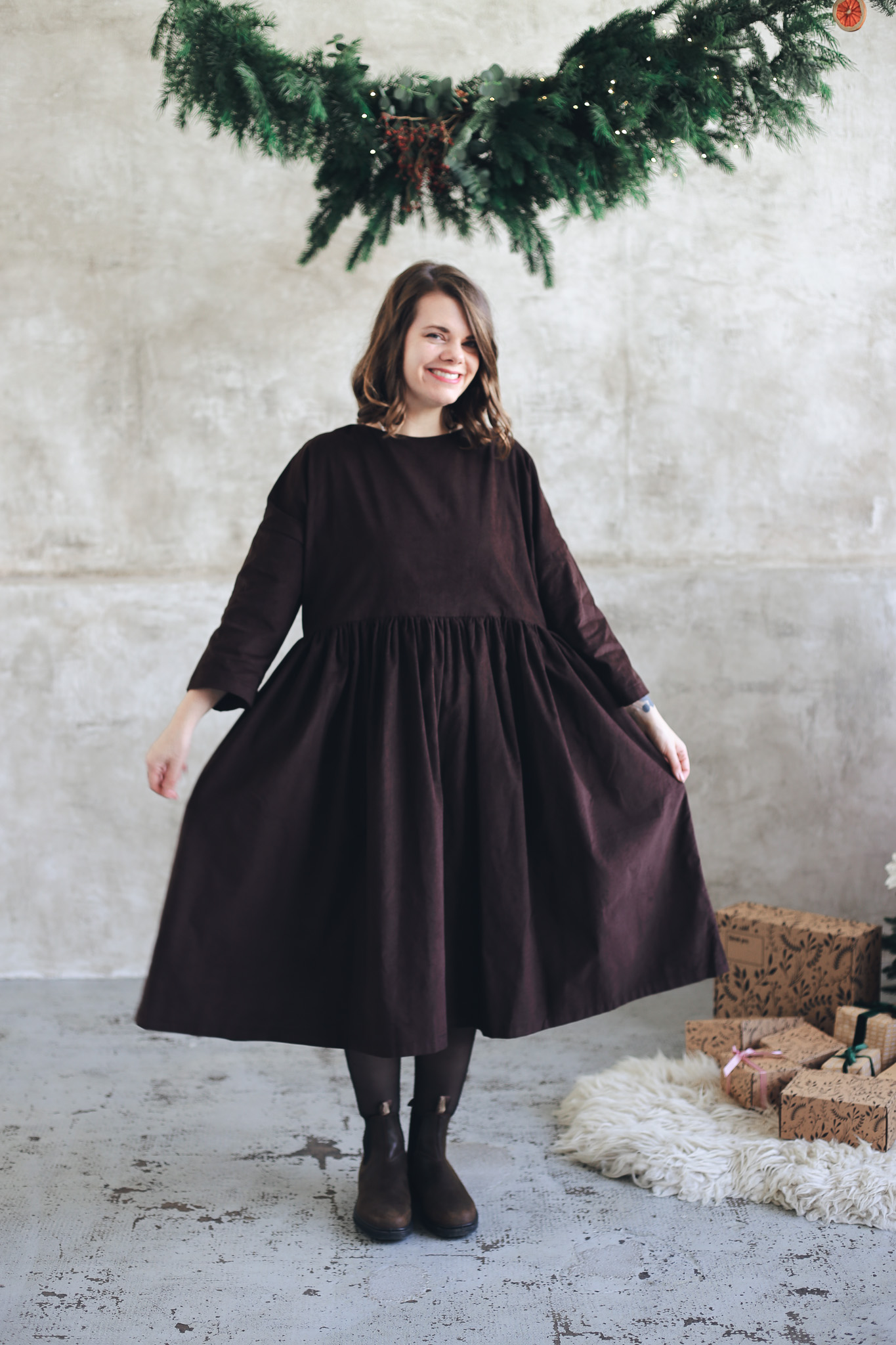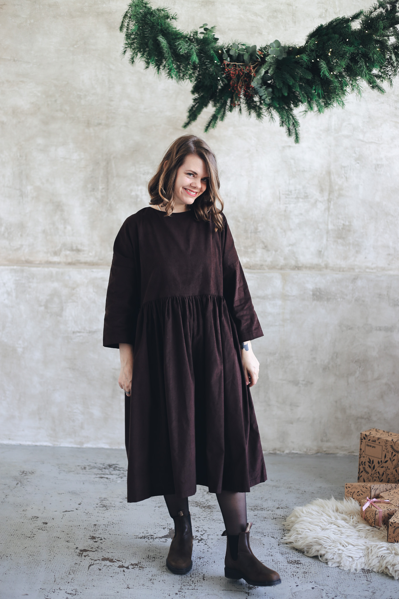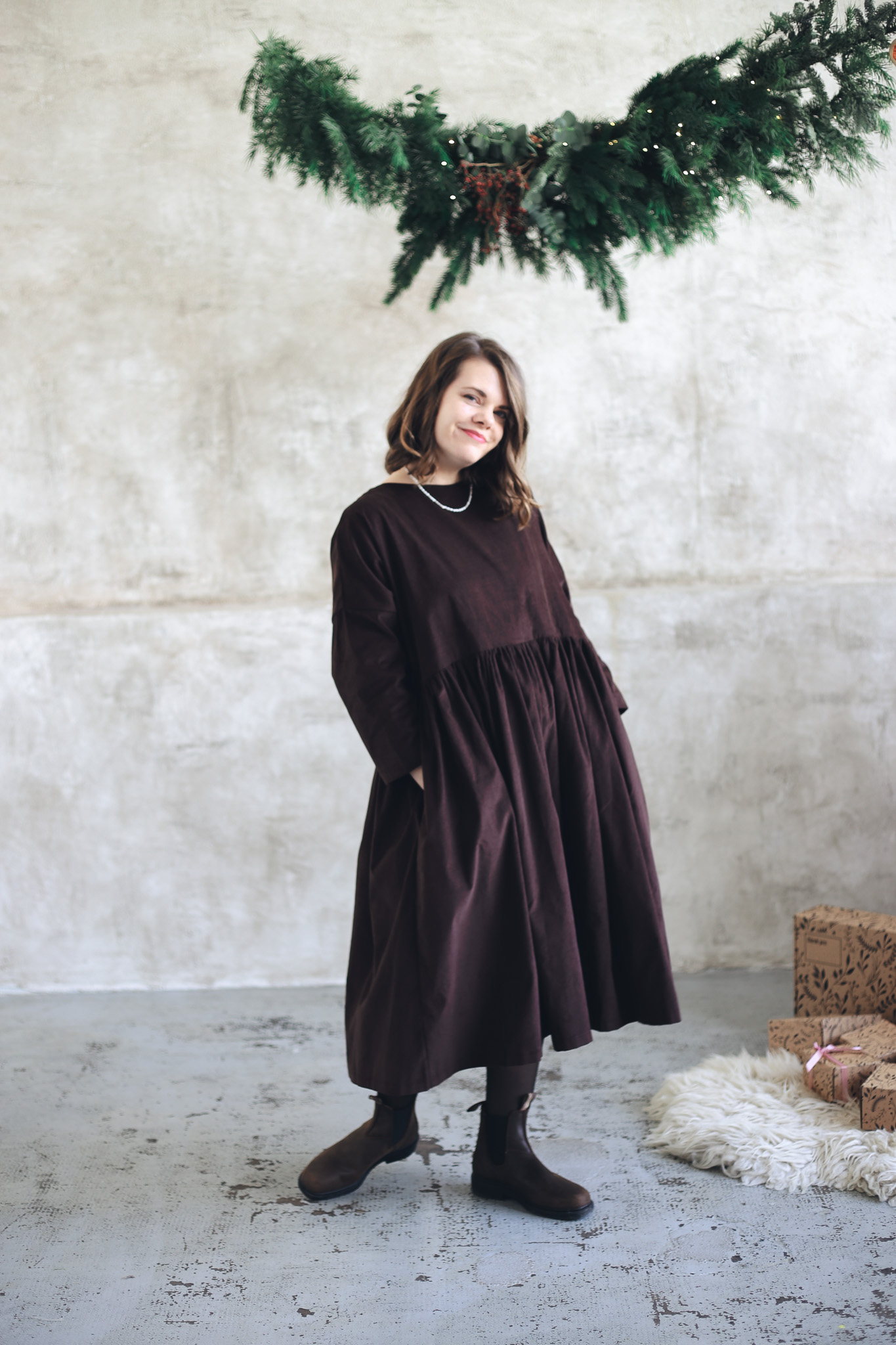 ׊aty Wide jsou volné šaty pouze v jedné velikosti, tyto jsou ušité z bavlněného manšestru, který je ideální na chladnější dny. Mají opravdu bohatou sukni, 7/8 spadený rukáv, který lze snadno ohrnout a na zádech malé zapínání na knoflíček. Šaty lze skvěle vrstvit třeba s tričkem Roll, s merino košilkou či s legíny.