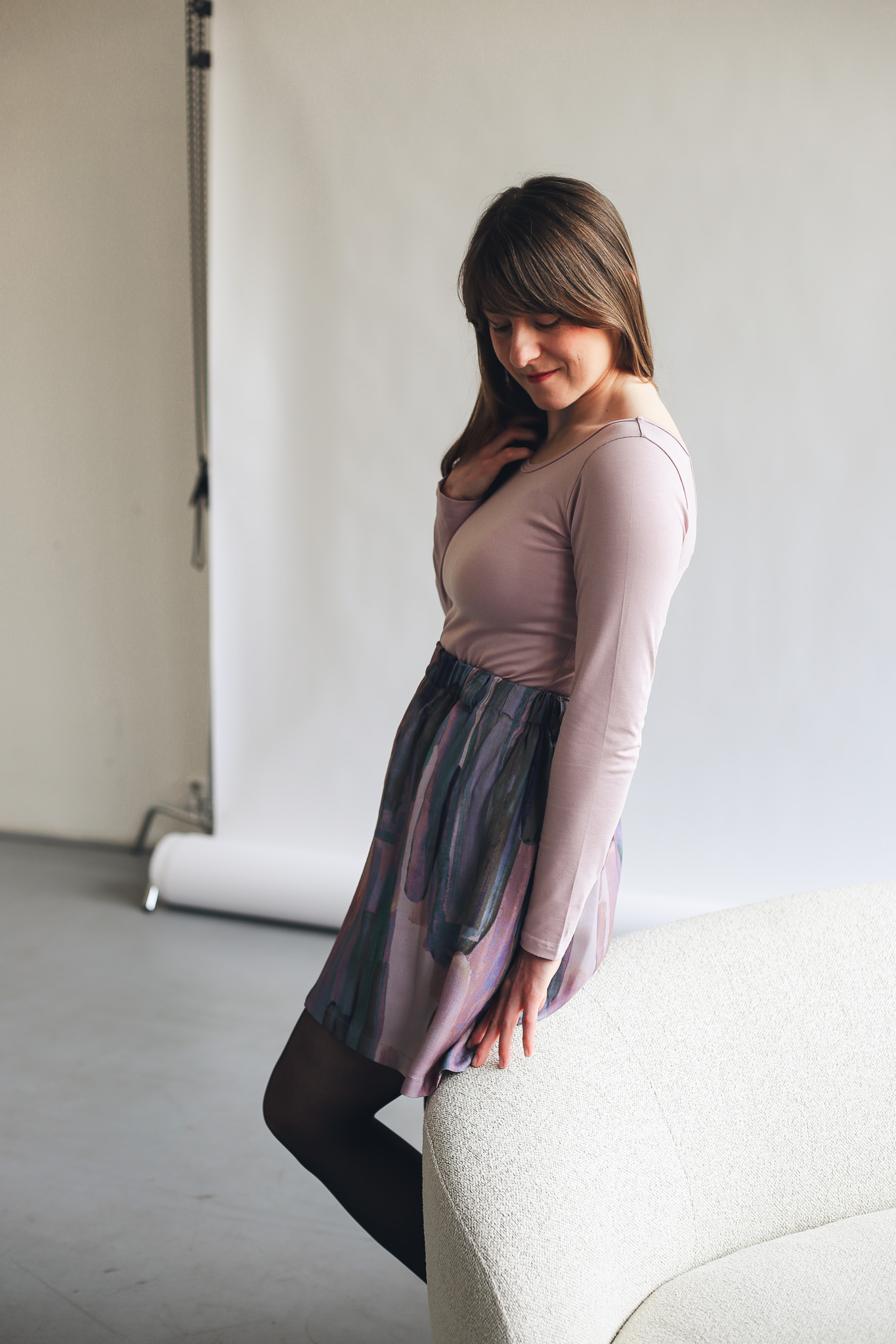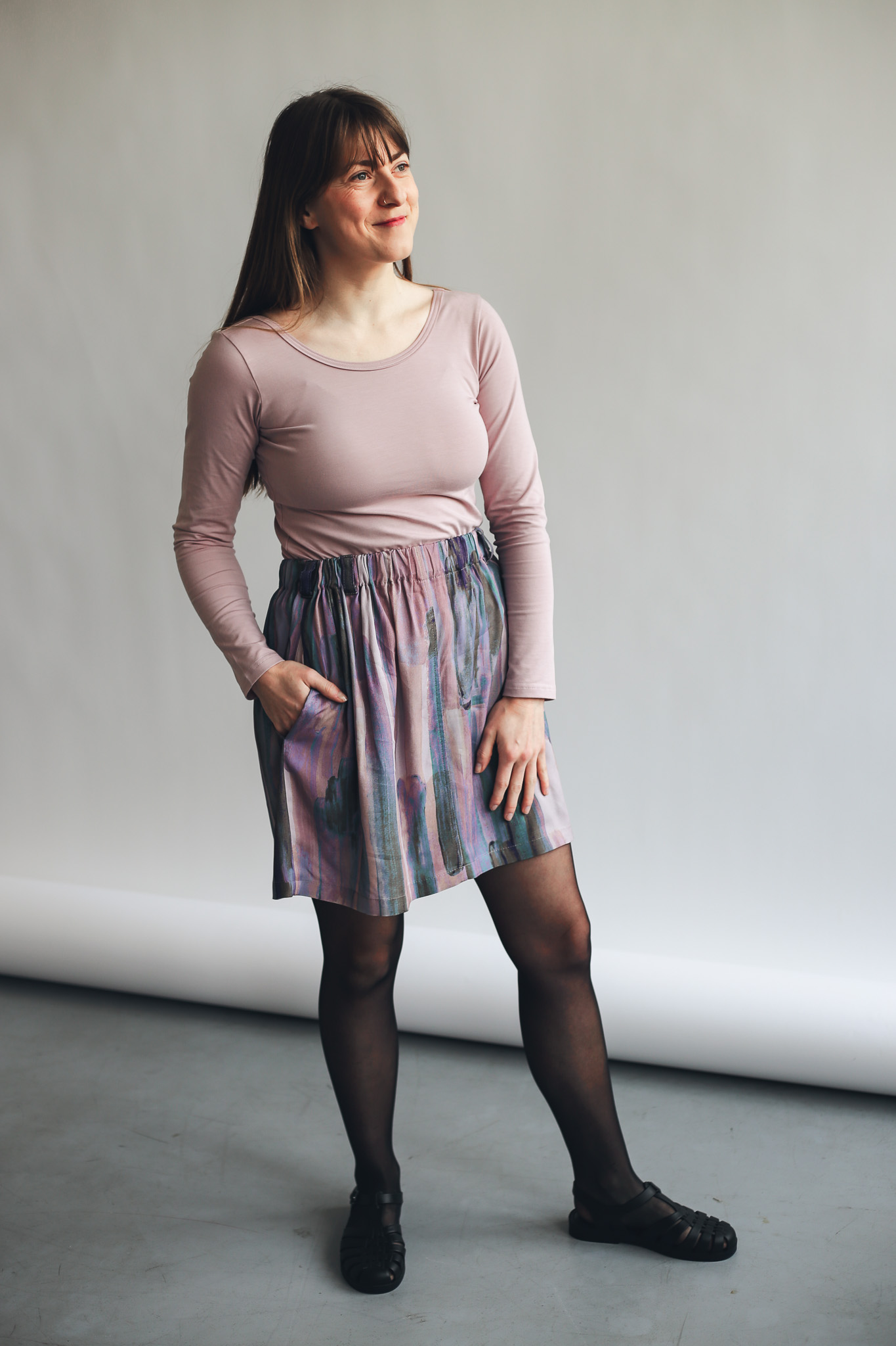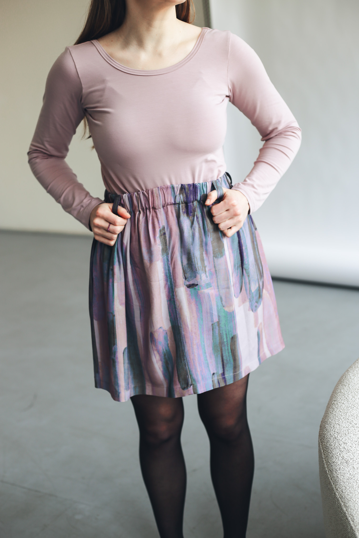 ×Krátká zero waste sukně s kapsami a poutky na pásek, která je opravdu udržitelným kouskem, protože je ušitá pouze z prostřihů, které nám vznikají při výrobě. V tomto případě se jedná o látku z autorské kolekce – ručně malovaný vzor, který vytvořila a graficky upravila sama majitelka značky Leona Průchová.