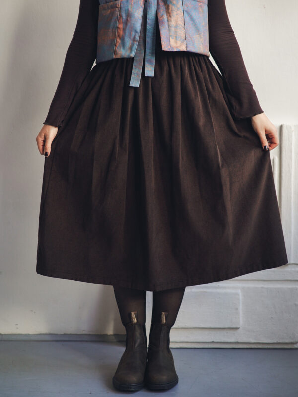 Dlouhá a široká sukně s kapsami a poutky na pásek, která je ušitá z elegantního jemného bavlněného manšestru. Univerzální kousek, který padne každé postavě. Tento model je vhodný i pro postavy s širšími boky. Sukně je ideální do chladnějšího počasí, přesto je lehoučká, splývavá a velmi slušivá, v pase má pružnou gumu, která se přizpůsobí a díky poutkám ji můžete doplnit páskem. Doporučujeme naši novinku mezi koženými doplňky: pásek Big.