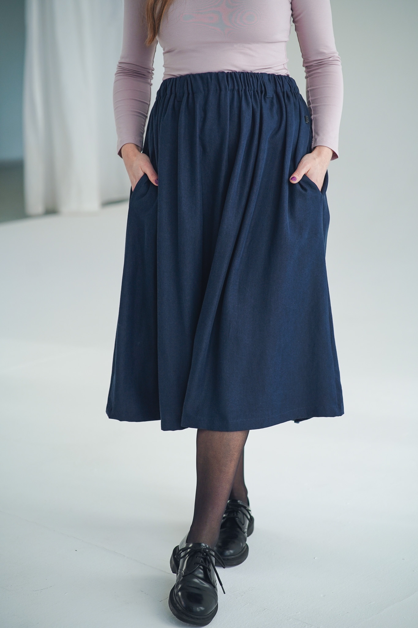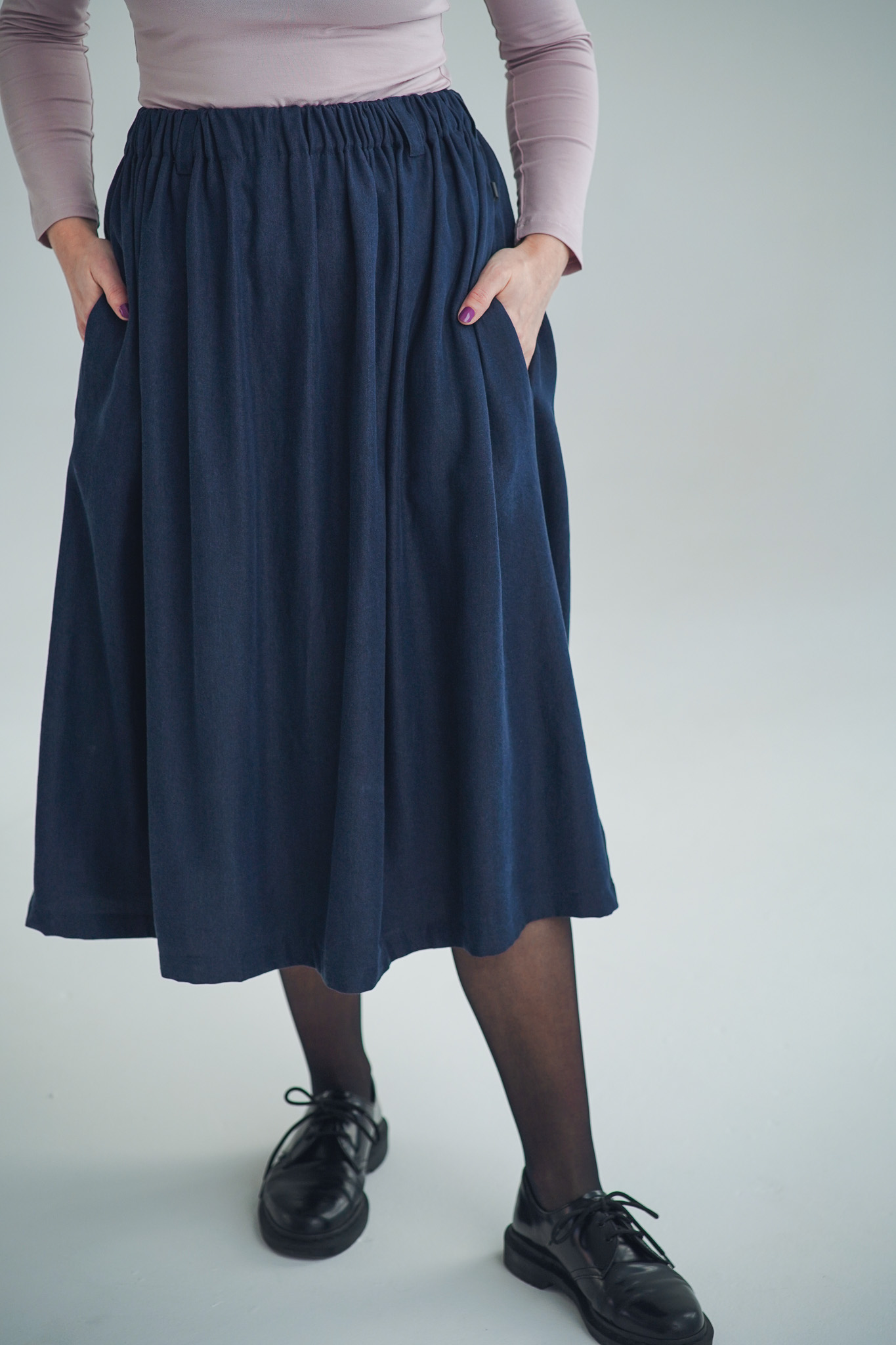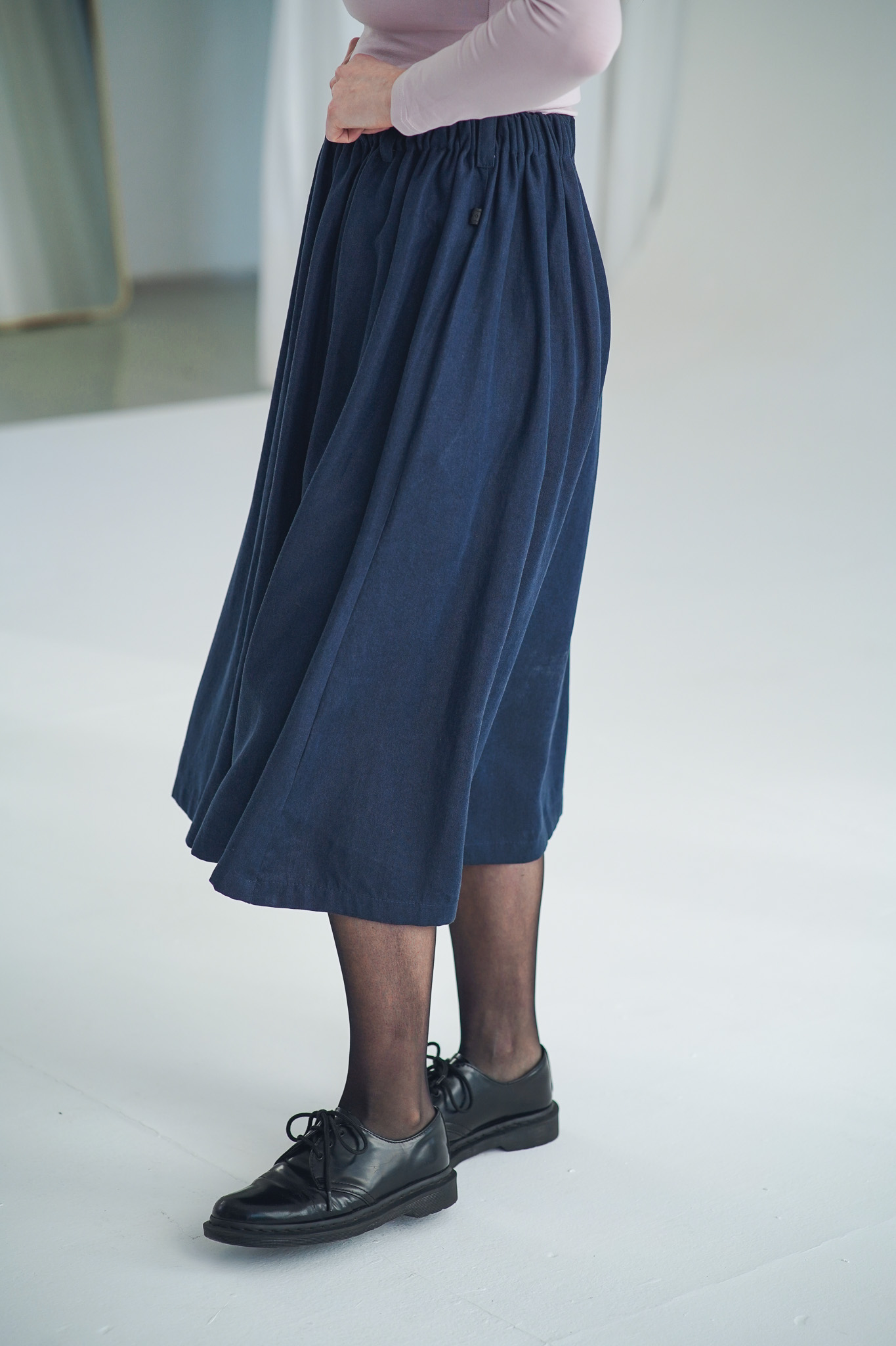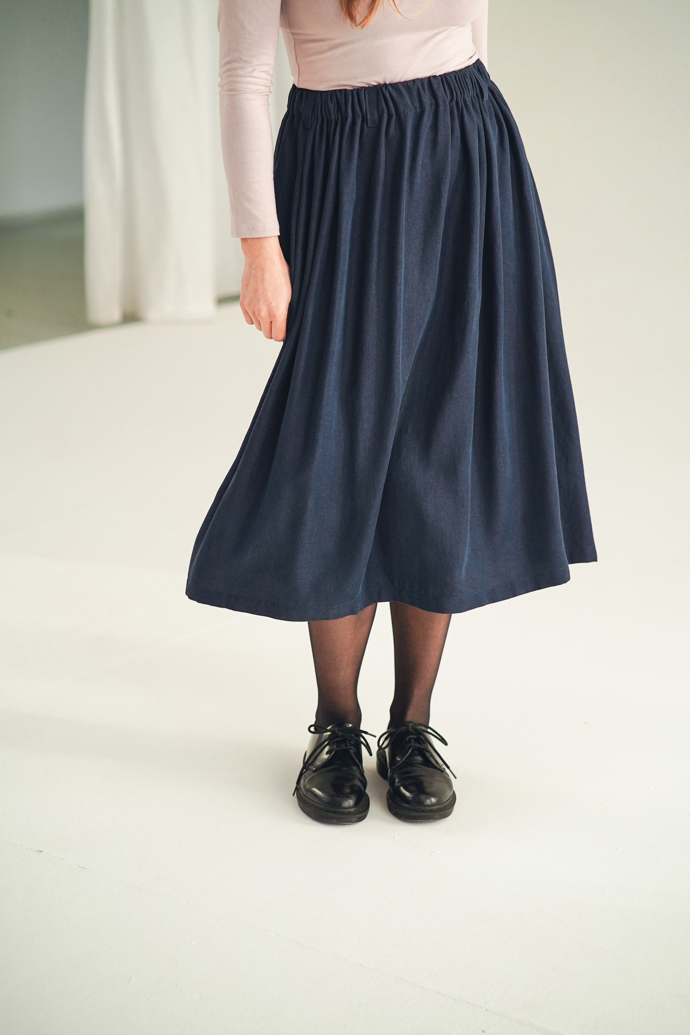 ×Dlouhá a široká sukně s kapsami a nově také s poutky na pásek, která je ušitá z elegantního a udržitelného tencelu. Univerzální kousek, který padne každé postavě. Tento model je vhodný i pro postavy s širšími boky. Sukně je lehoučká, splývavá a velmi slušivá a v pase má pružnou gumu, která se přizpůsobí a díky poutkám ji můžete doplnit páskem (viz. třetí fotografie). Doporučujeme naši novinku mezi koženými doplňky: pásek Big.