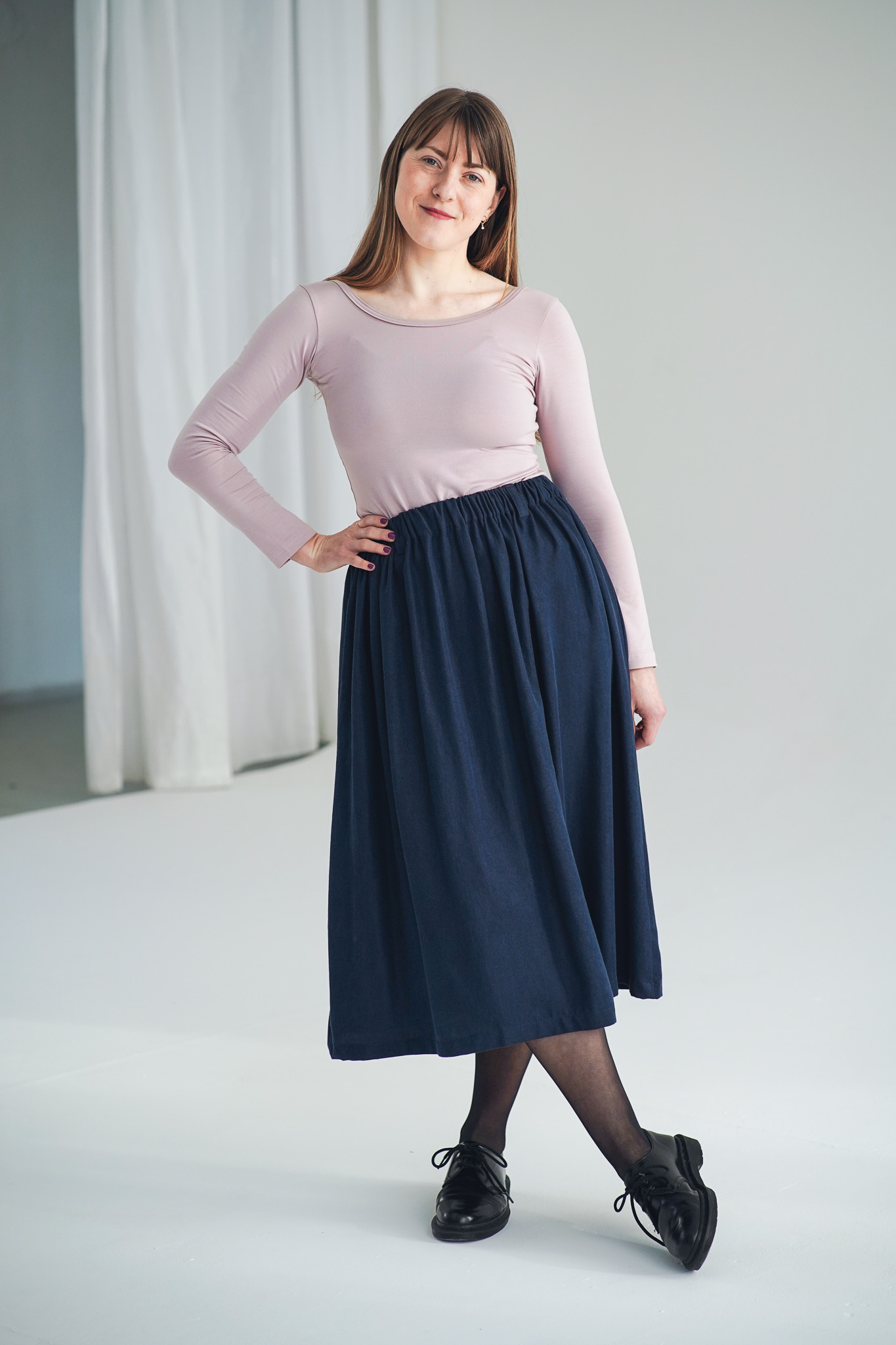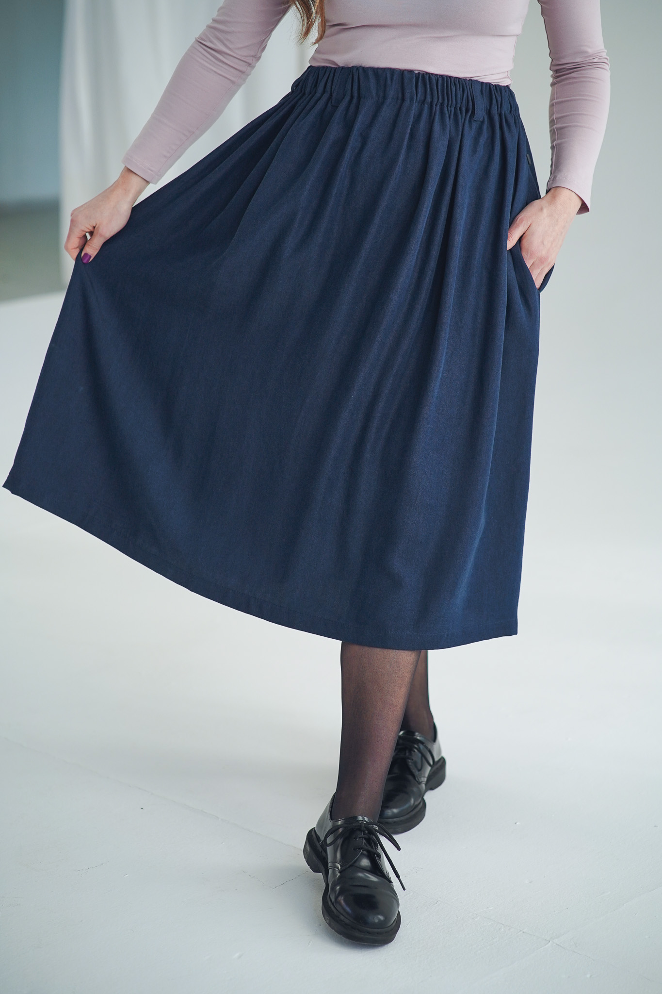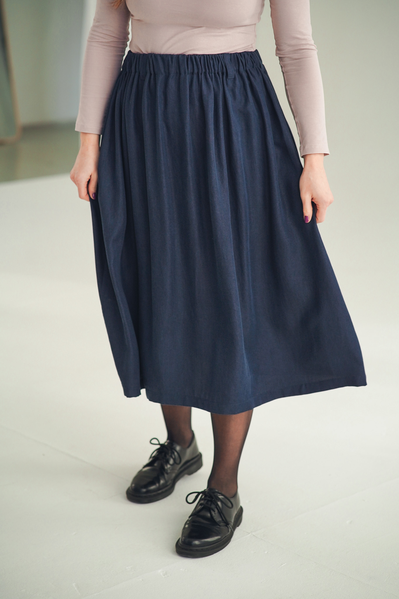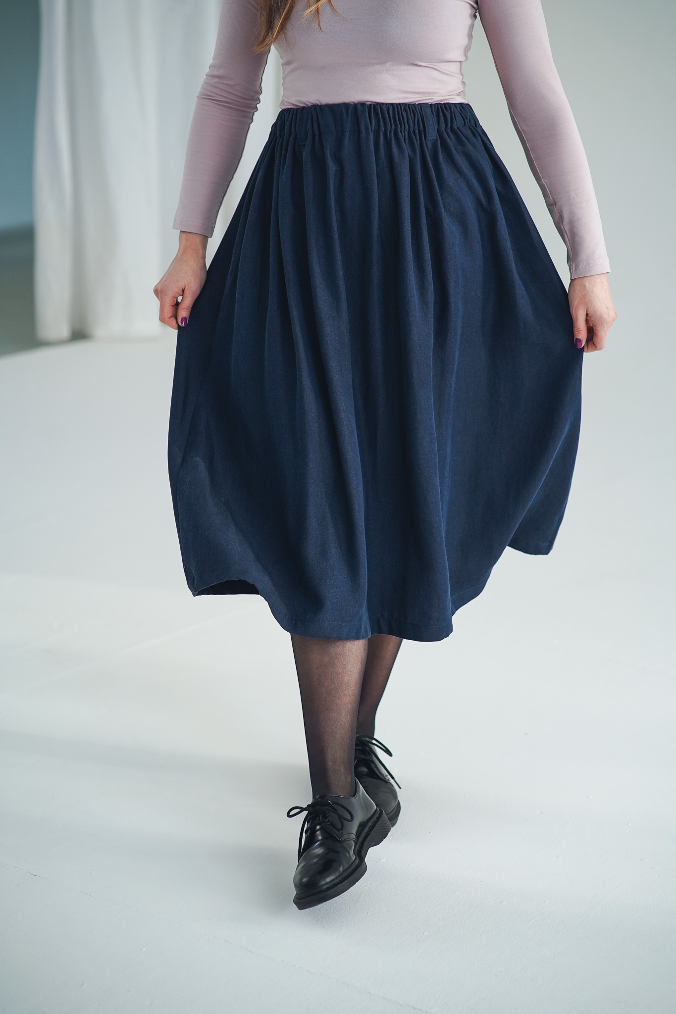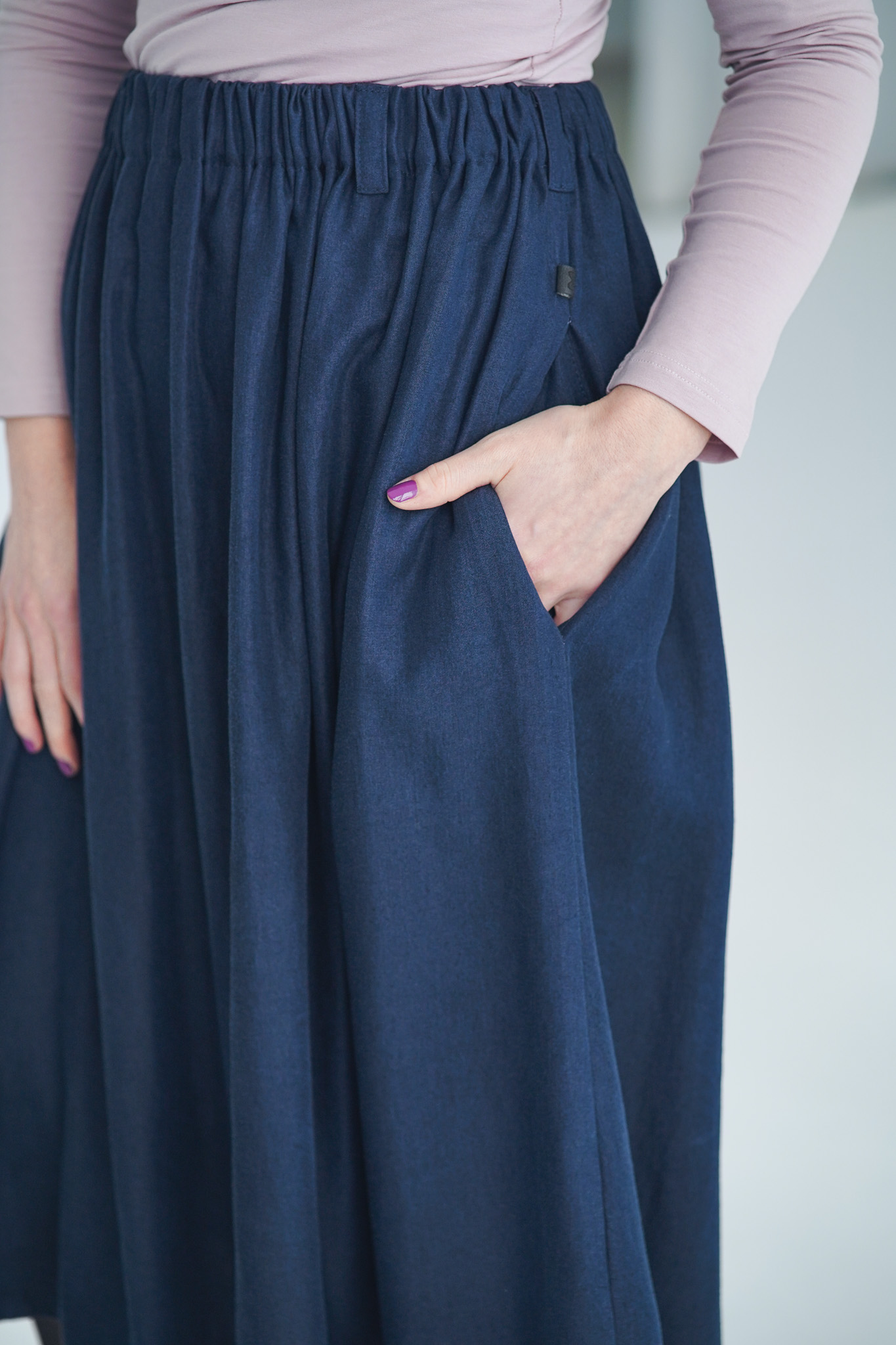 ×Dlouhá a široká sukně s kapsami a nově také s poutky na pásek, která je ušitá z elegantního a udržitelného tencelu. Univerzální kousek, který padne každé postavě. Tento model je vhodný i pro postavy s širšími boky. Sukně je lehoučká, splývavá a velmi slušivá a v pase má pružnou gumu, která se přizpůsobí a díky poutkám ji můžete doplnit páskem (viz. třetí fotografie). Doporučujeme naši novinku mezi koženými doplňky: pásek Big.
