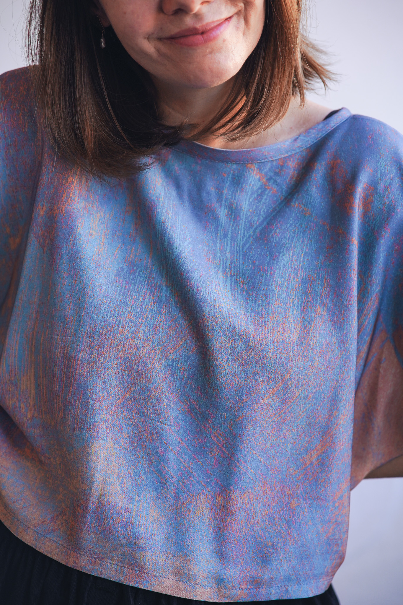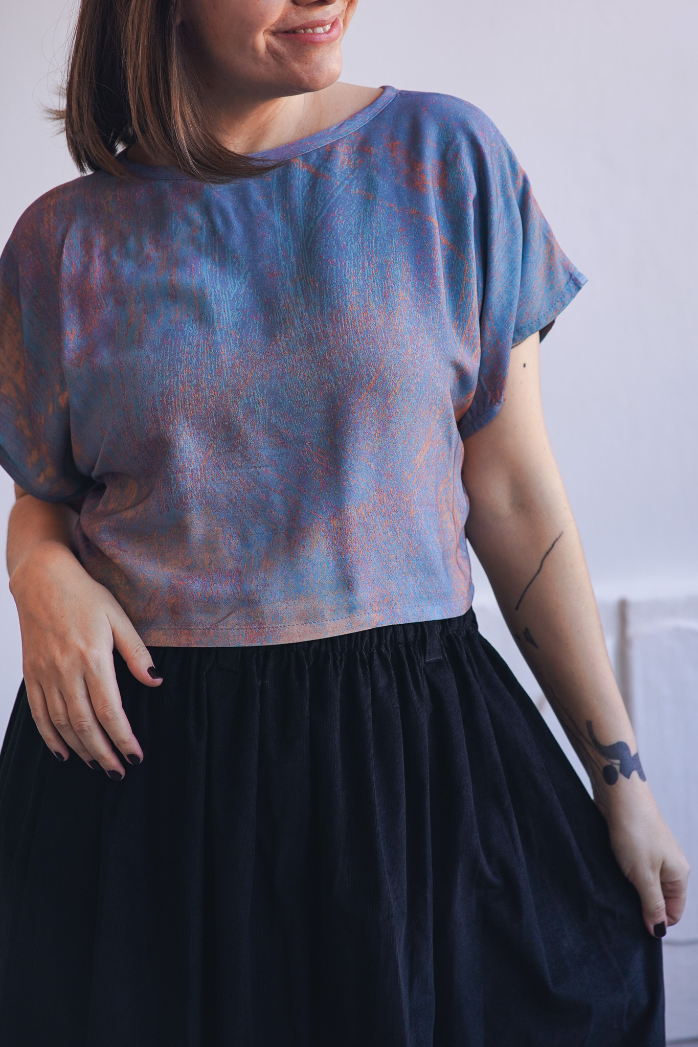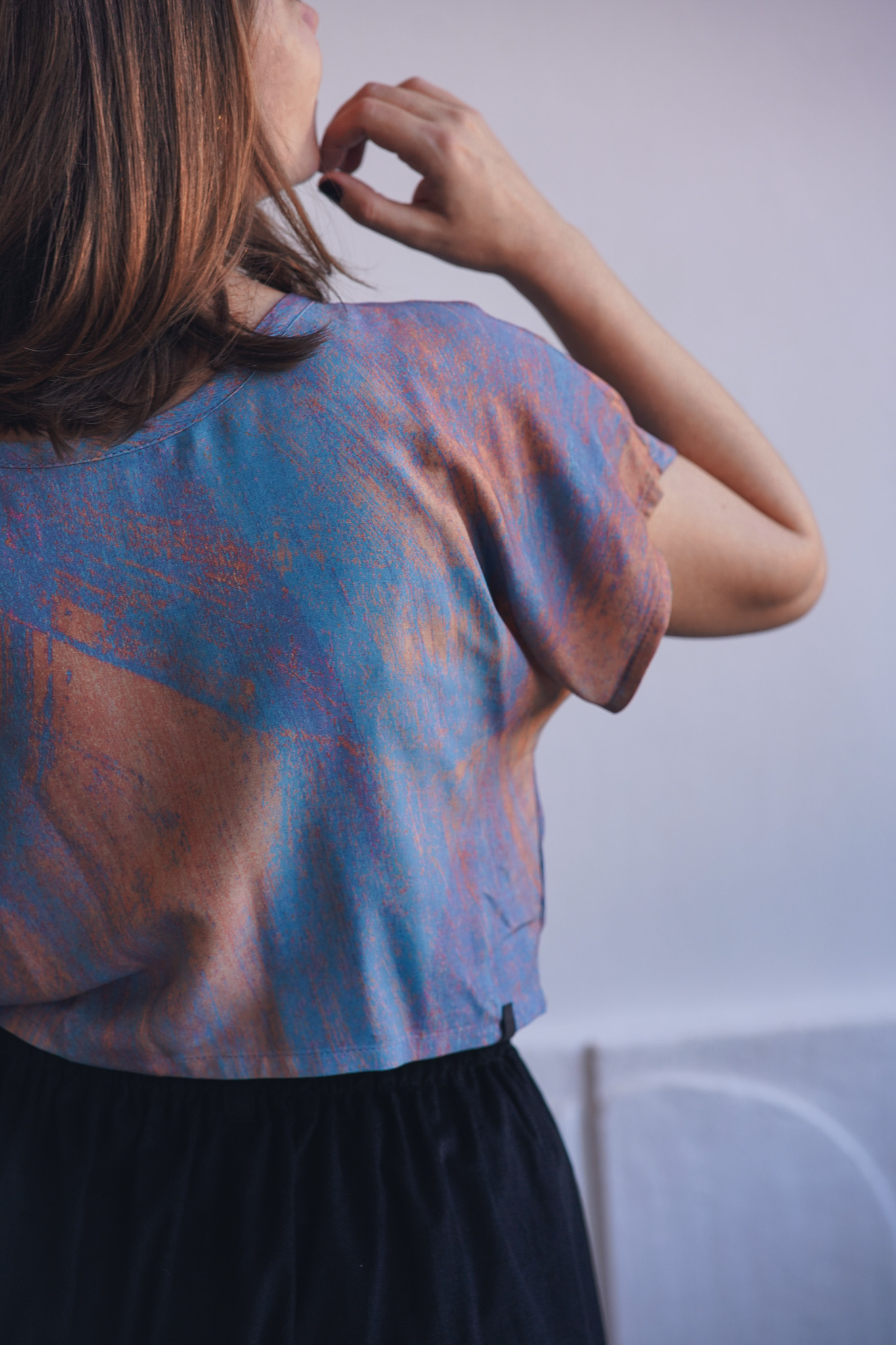 ×Minimalistické zero waste tričko kratšího širokého střihu z jemné viskózy. Má volnější, pohodlný střih, nepruží a je ideální do horkých letních dnů. Tričko je ušité pouze z prostřihů, které nám vznikají při výrobě ostatních kousků a tak je skutečně zero waste a udržitelné. V tomto případě se jedná o látku z autorské kolekce – ručně malovaný vzor, který vytvořila a graficky upravila sama majitelka značky Leona Průchová.