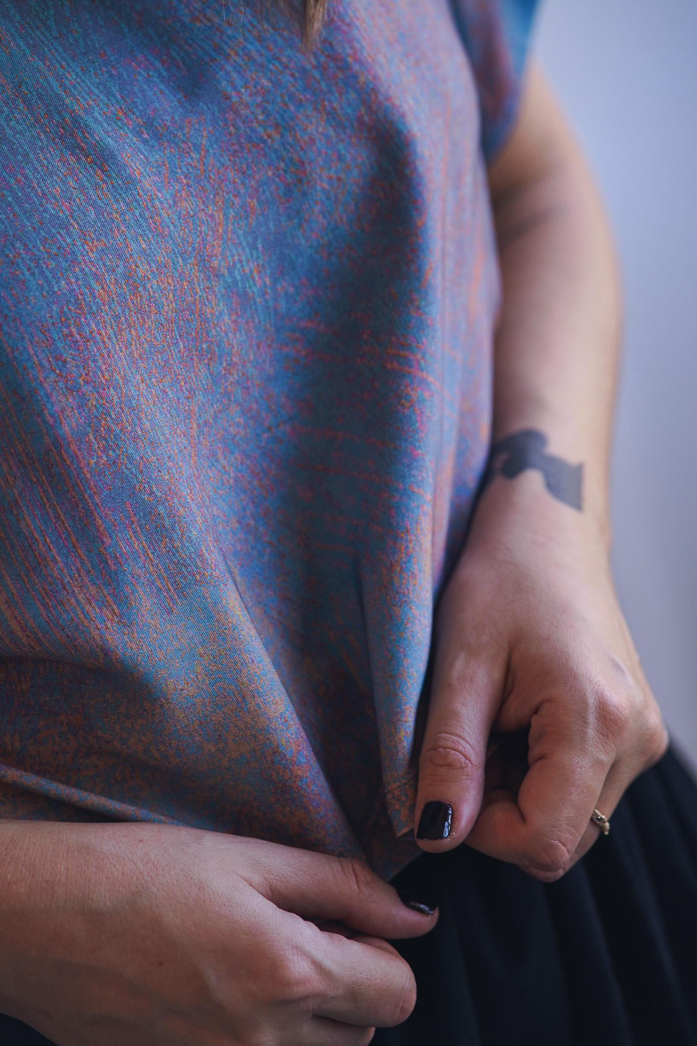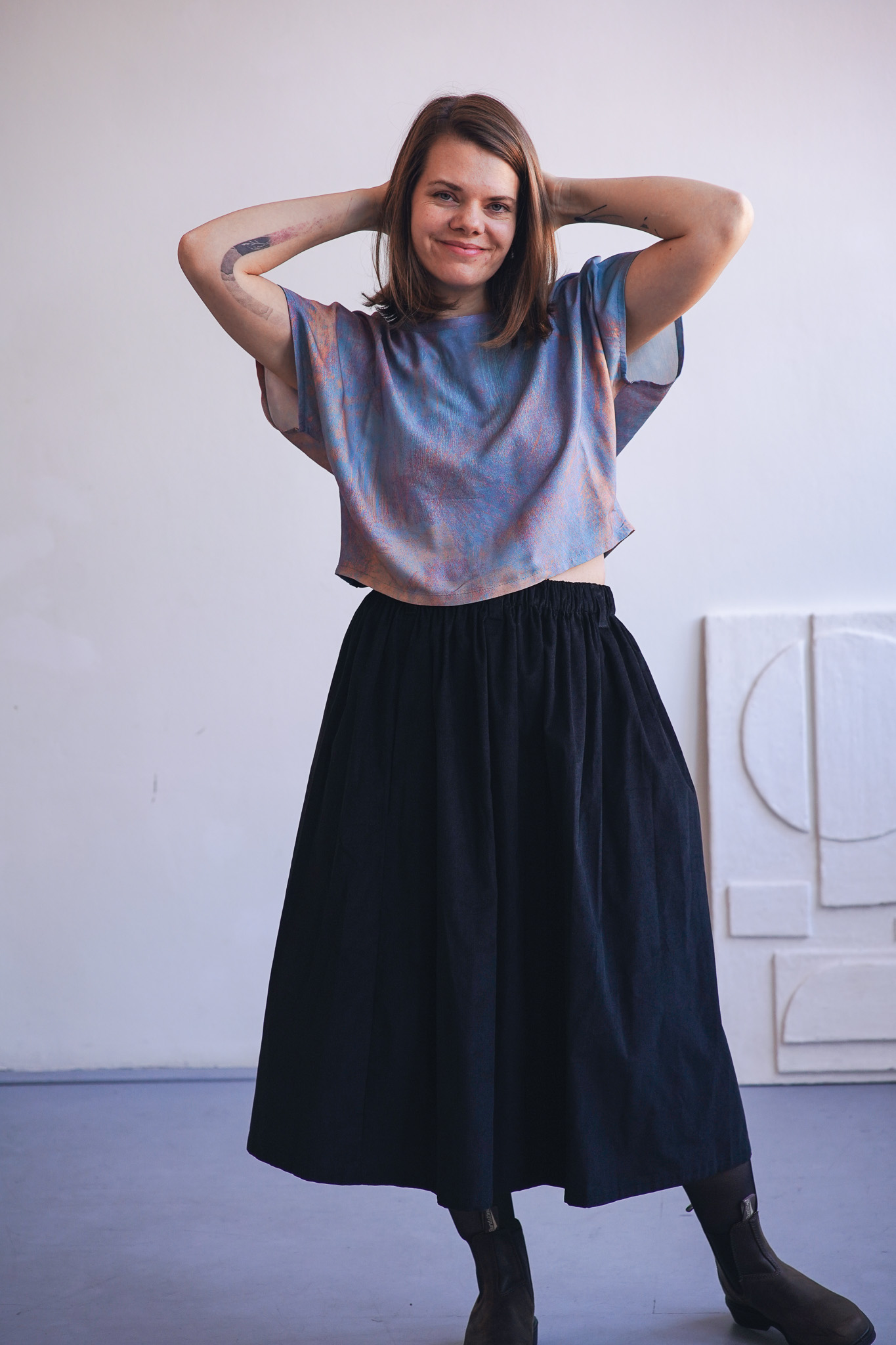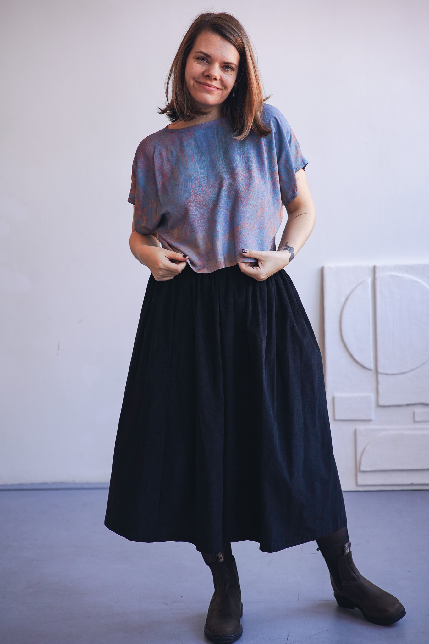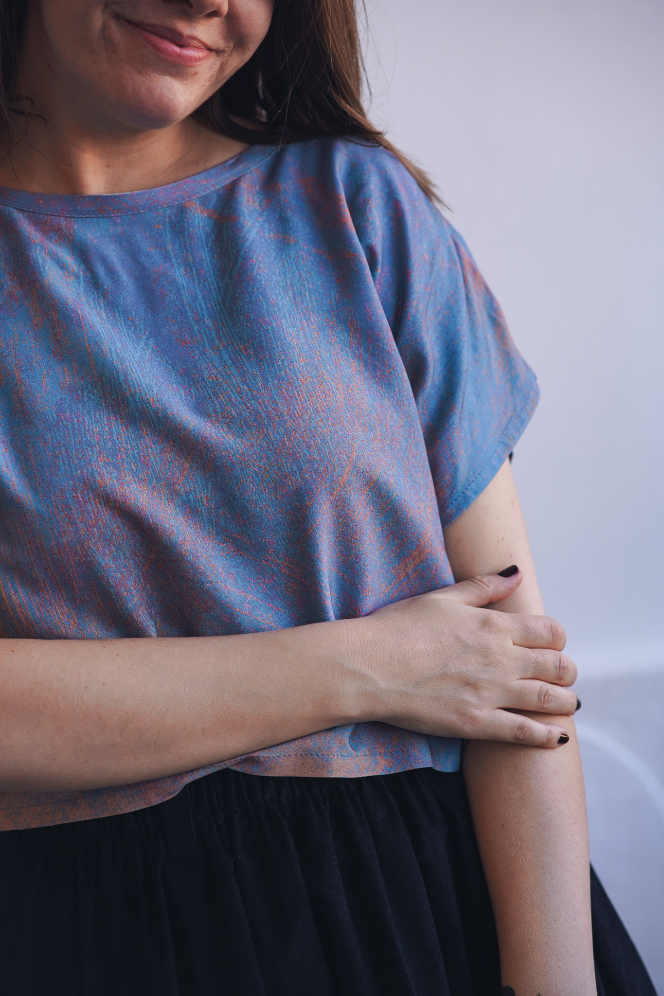×Minimalistické zero waste tričko kratšího širokého střihu z jemné viskózy. Má volnější, pohodlný střih, nepruží a je ideální do horkých letních dnů. Tričko je ušité pouze z prostřihů, které nám vznikají při výrobě ostatních kousků a tak je skutečně zero waste a udržitelné. V tomto případě se jedná o látku z autorské kolekce – ručně malovaný vzor, který vytvořila a graficky upravila sama majitelka značky Leona Průchová.
