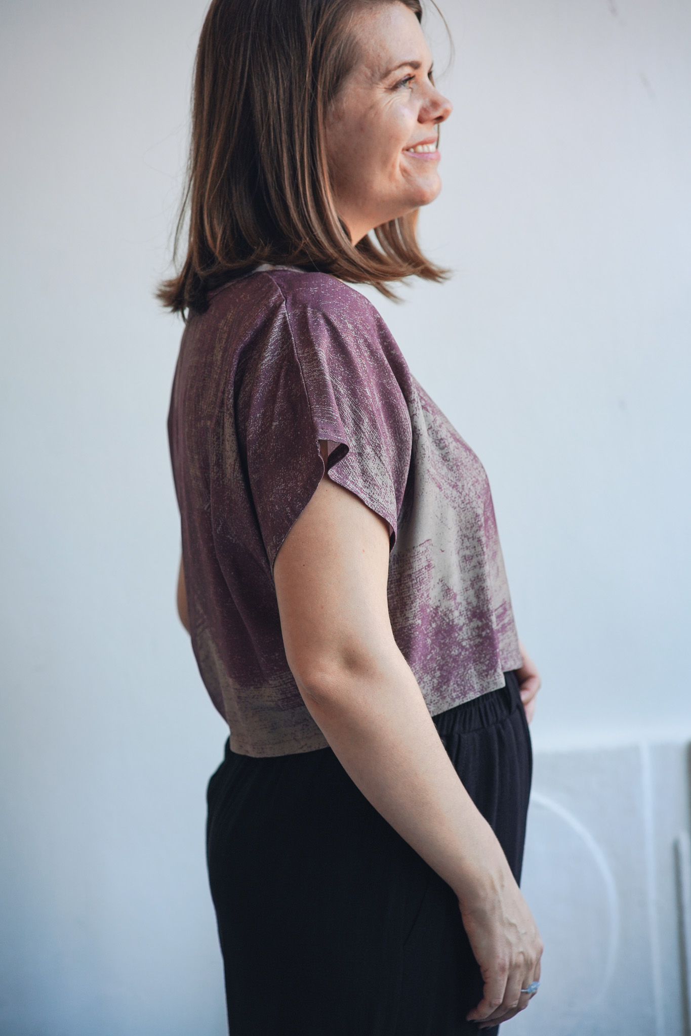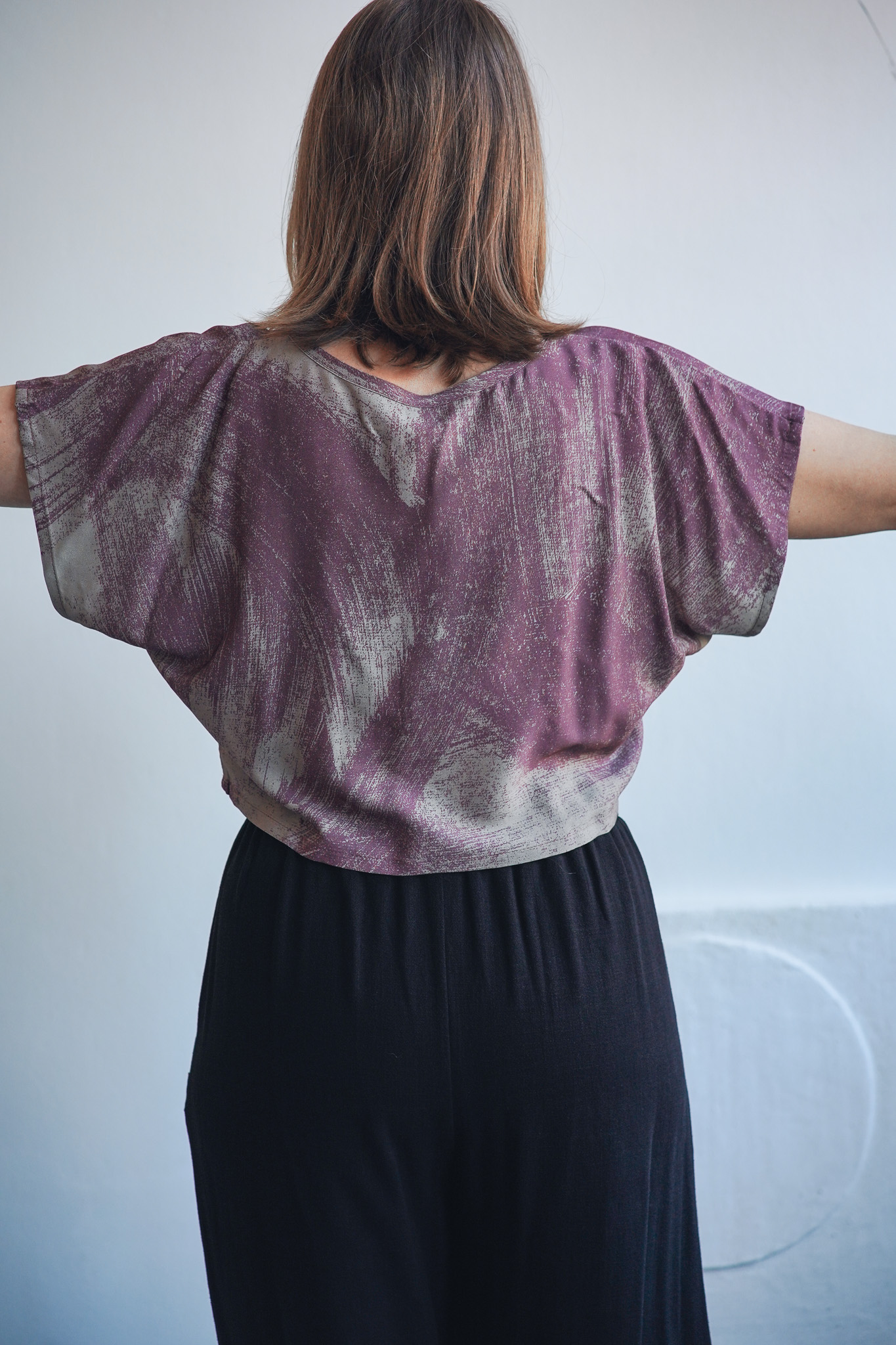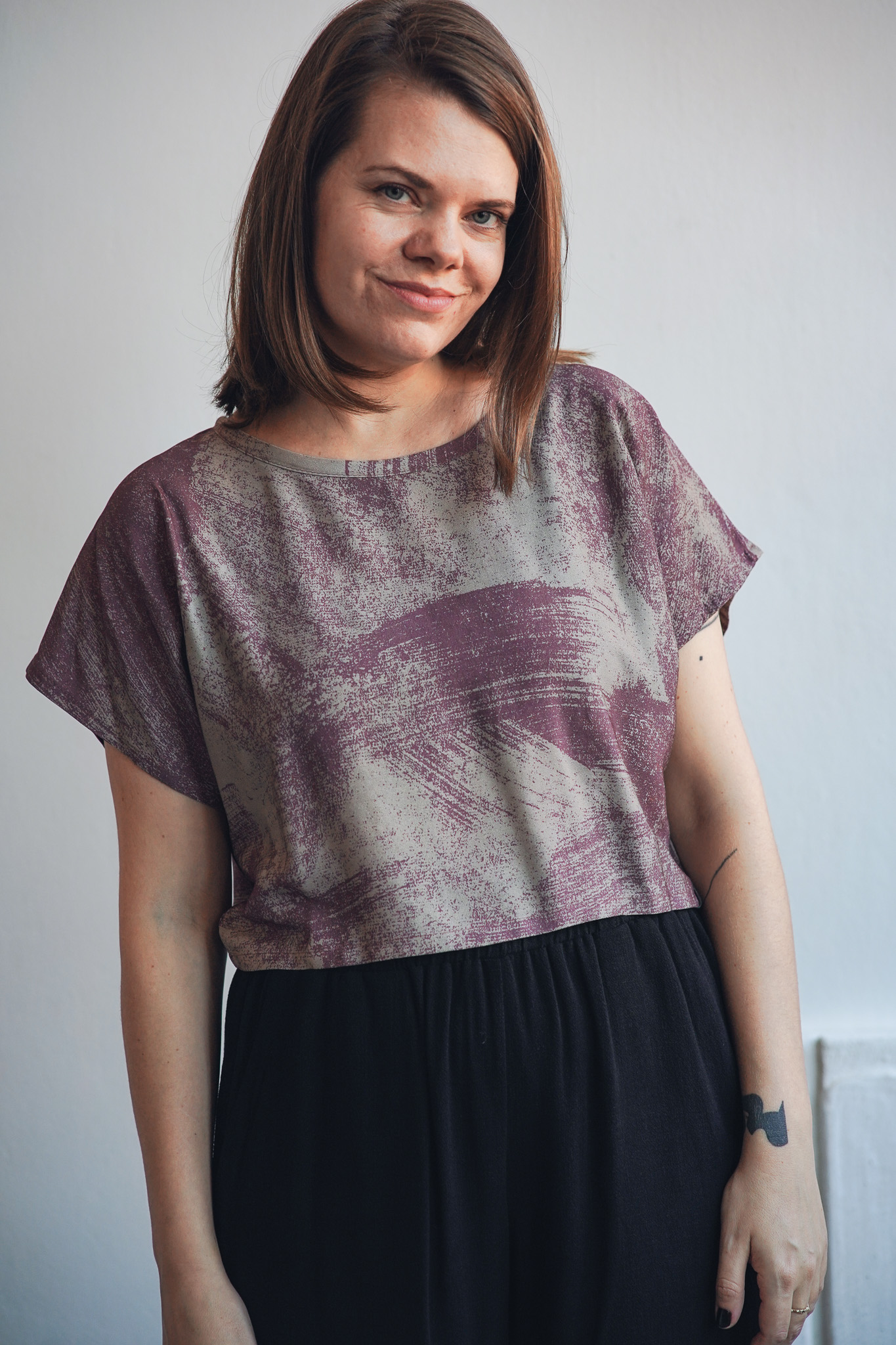 ×Minimalistické zero waste tričko kratšího širokého střihu z jemné viskózy. Má volnější, pohodlný střih, nepruží a je ideální do horkých letních dnů. Tričko je ušité pouze z prostřihů, které nám vznikají při výrobě ostatních kousků a tak je skutečně zero waste a udržitelné. V tomto případě se jedná o látku z autorské kolekce – ručně malovaný vzor, který vytvořila a graficky upravila sama majitelka značky Leona Průchová.
