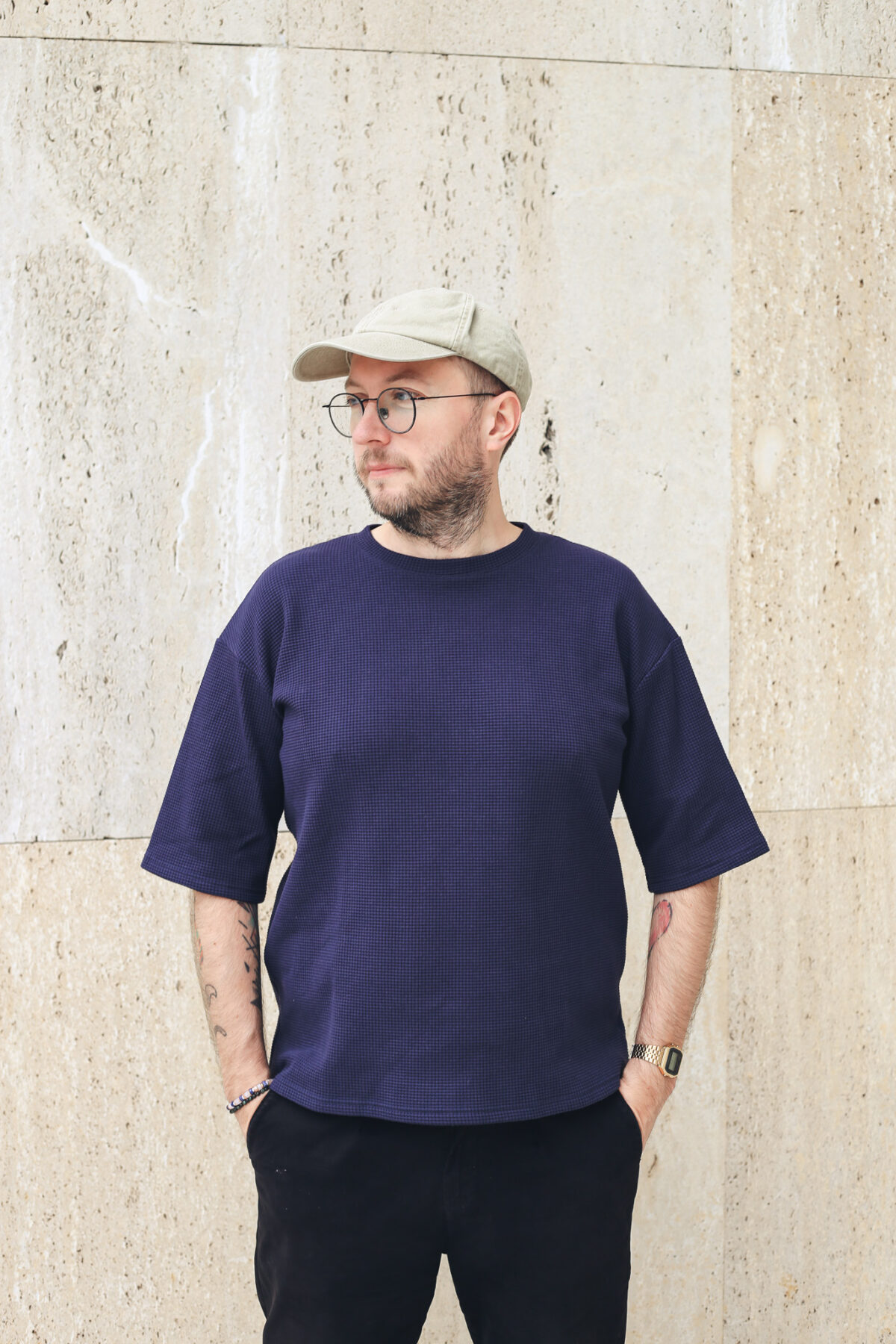 Minimalistické tričko v pánském širším a mírně prodlouženém střihu je ušité z velmi příjemné strukturované bavlny – vafloviny, která je měkká, poddajná a minimálně se mačká. Tričko unosíte celoročně a nemusí být nutně pouze pro pány, kdo má rád volná trika, bude slušet i ženám. Můžete ho nosit s ohrnutými rukávy a budete z toho mít volnější tričko, které si můžete sladit se svým partnerem a zastrčit si ho do sukně či do kalhot, případně zvolit dámskou variantu wide crop.